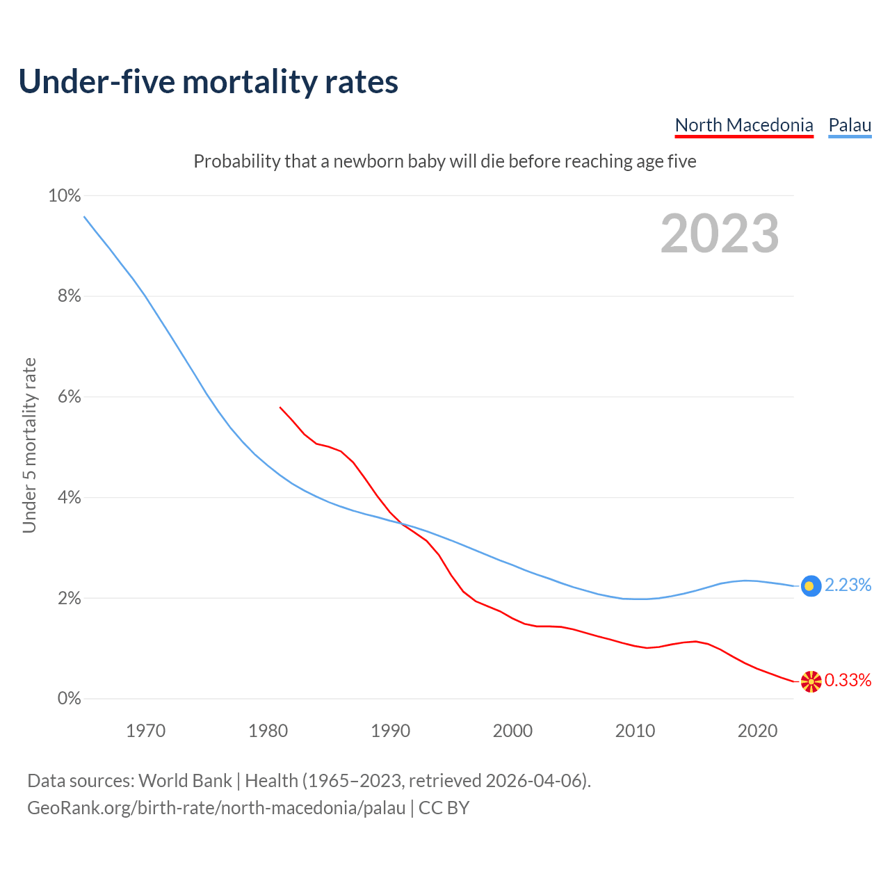 The chance that a newborn baby will die before reaching age five is 0.33% in North Macedonia and 2.23% in Palau. Above is a chart with historical data on under-five mortality rates.