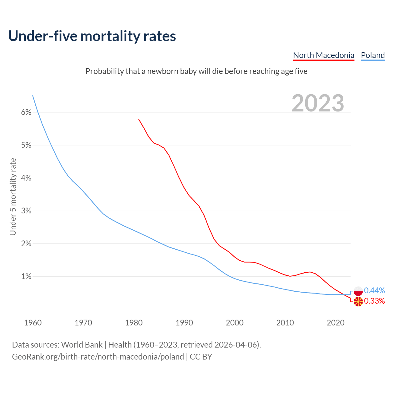 The chance that a newborn baby will die before reaching age five is 0.33% in North Macedonia and 0.44% in Poland. Above is a chart with historical data on under-five mortality rates.