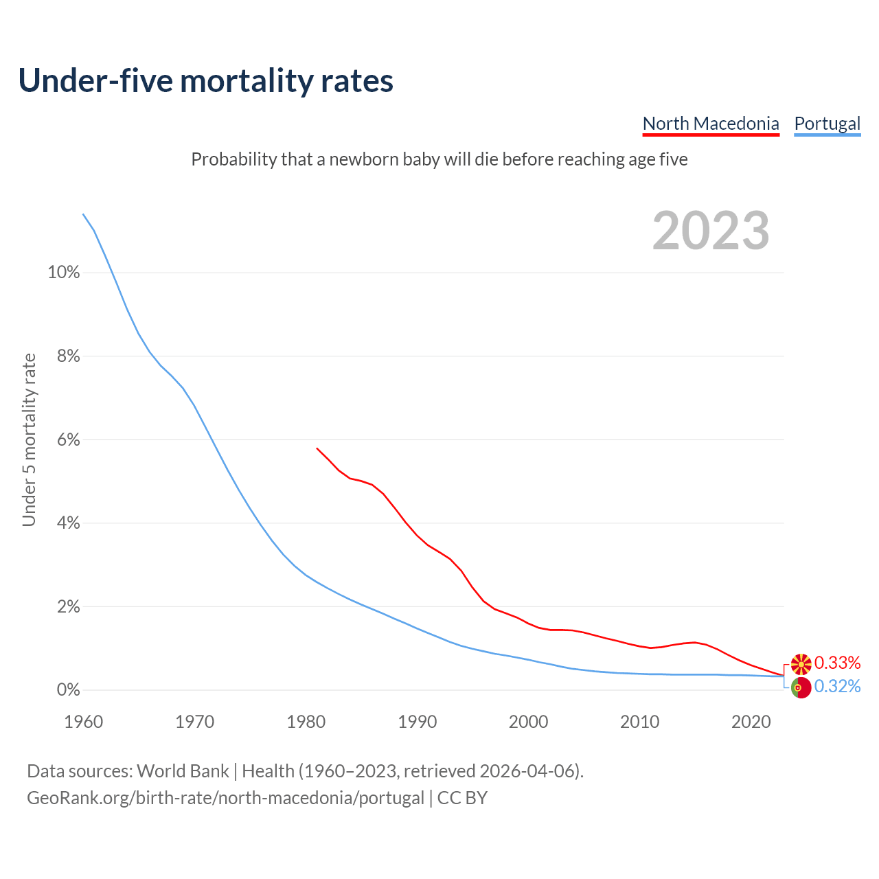 The chance that a newborn baby will die before reaching age five is 0.33% in North Macedonia and 0.32% in Portugal. Above is a chart with historical data on under-five mortality rates.