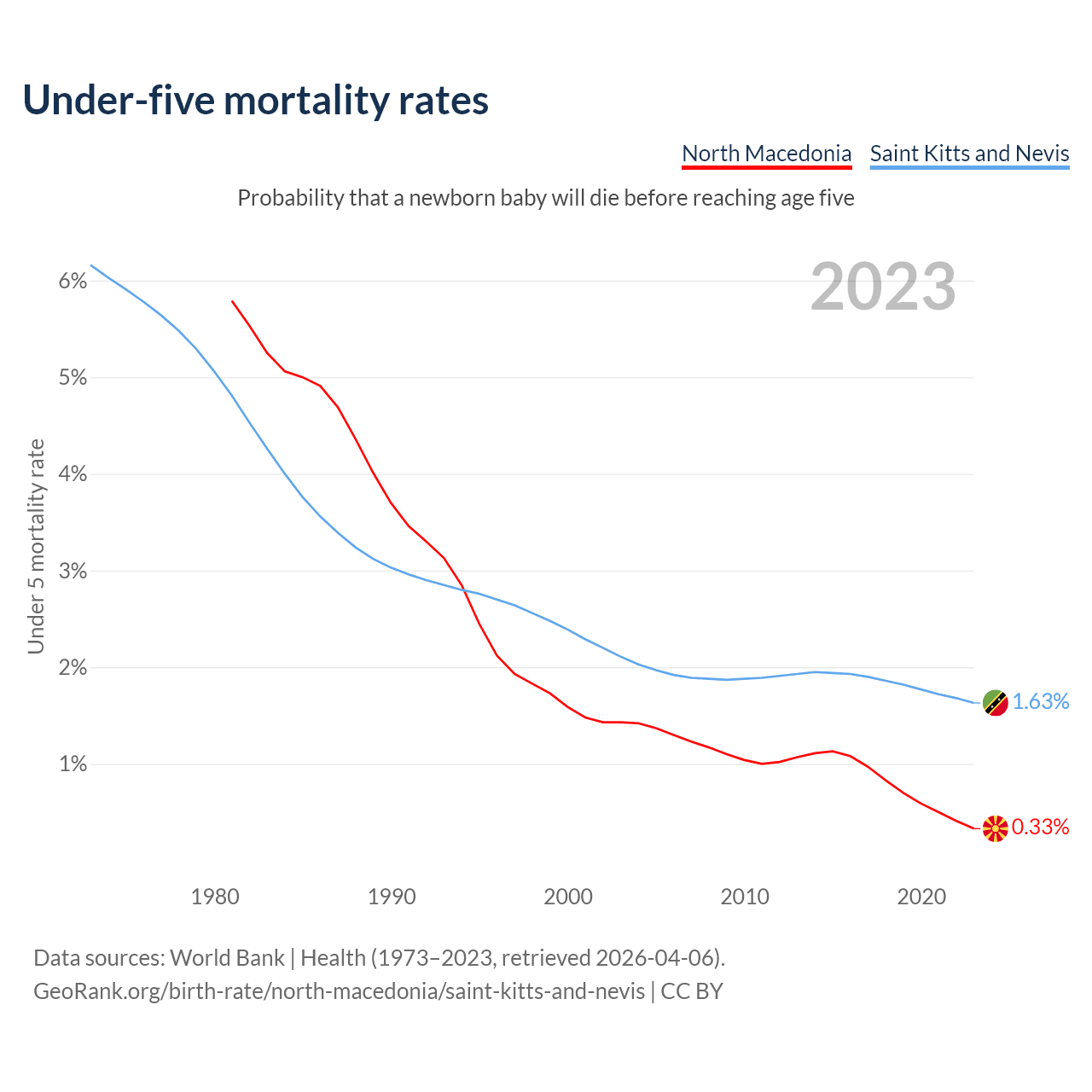 The chance that a newborn baby will die before reaching age five is 0.33% in North Macedonia and 1.63% in Saint Kitts and Nevis. Above is a chart with historical data on under-five mortality rates.