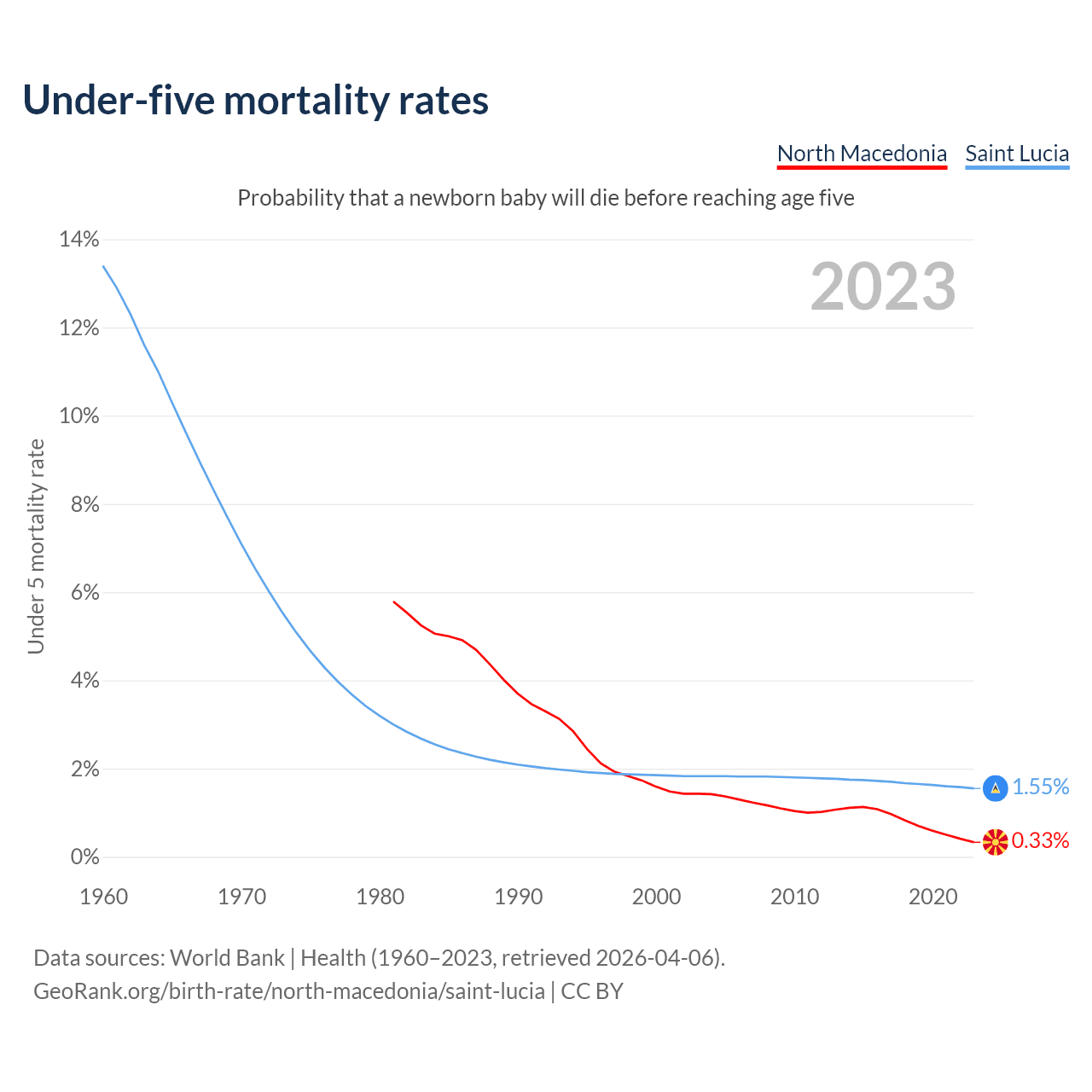The chance that a newborn baby will die before reaching age five is 0.33% in North Macedonia and 1.55% in Saint Lucia. Above is a chart with historical data on under-five mortality rates.