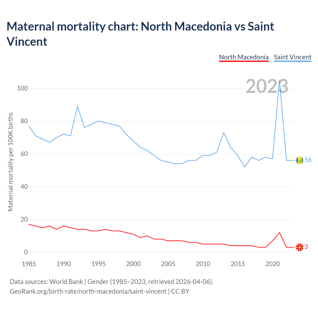 The maternal mortality rate, which is the probability of dying during childbirth or within 42 days of pregnancy termination, is 3 deaths per 100,000 live births in North Macedonia, compared to 56 deaths in Saint Vincent.