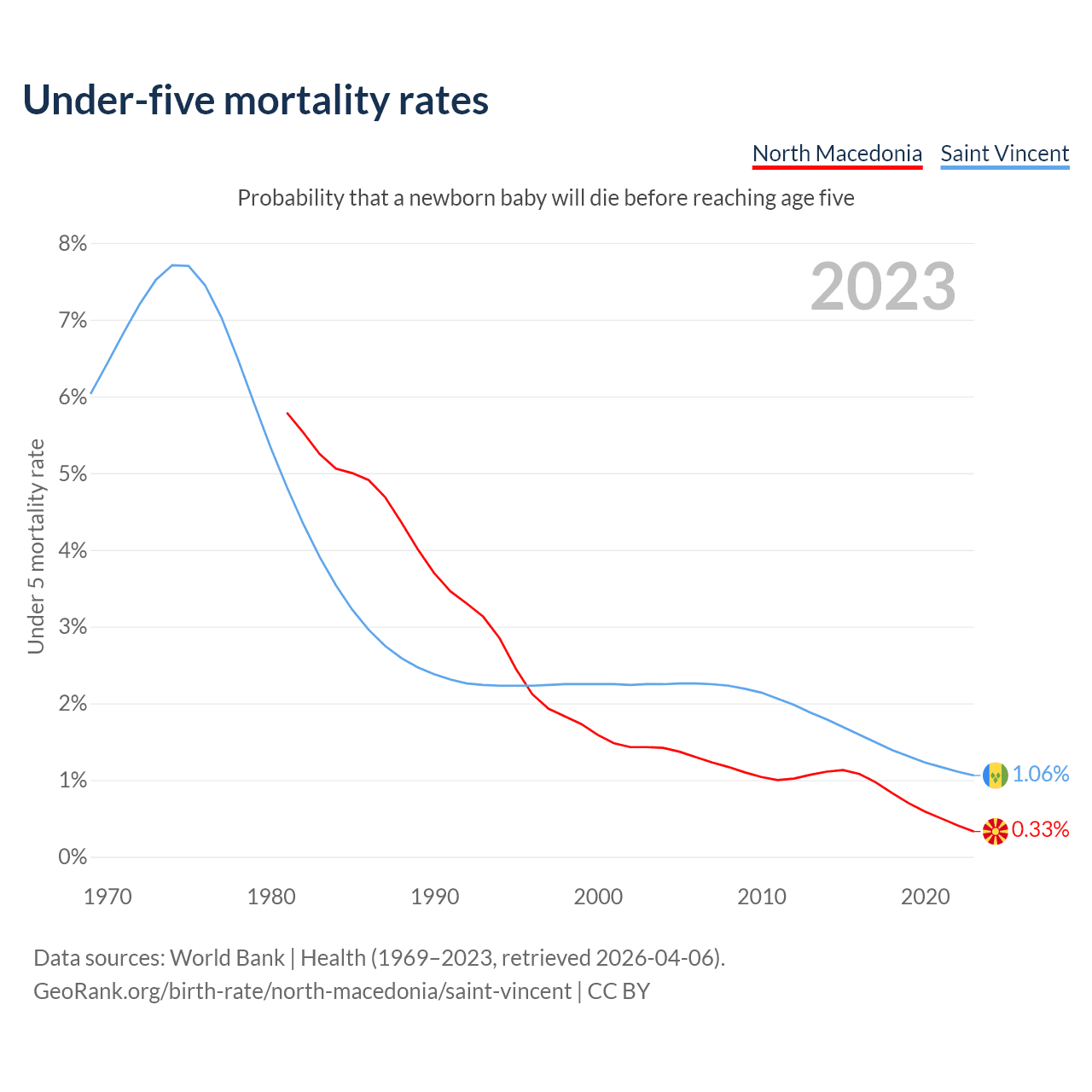 The chance that a newborn baby will die before reaching age five is 0.33% in North Macedonia and 1.06% in Saint Vincent. Above is a chart with historical data on under-five mortality rates.