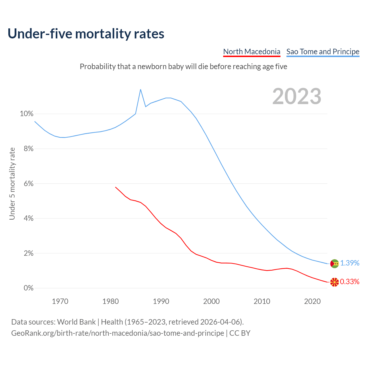 The chance that a newborn baby will die before reaching age five is 0.33% in North Macedonia and 1.39% in Sao Tome and Principe. Above is a chart with historical data on under-five mortality rates.