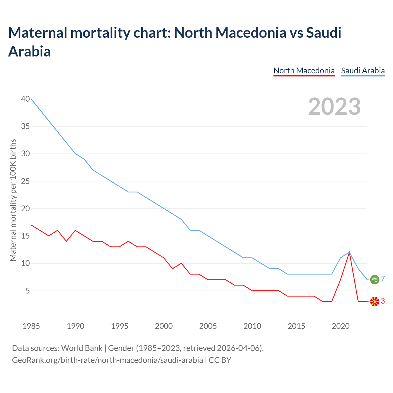 The maternal mortality rate, which is the probability of dying during childbirth or within 42 days of pregnancy termination, is 3 deaths per 100,000 live births in North Macedonia, compared to 7 deaths in Saudi Arabia.