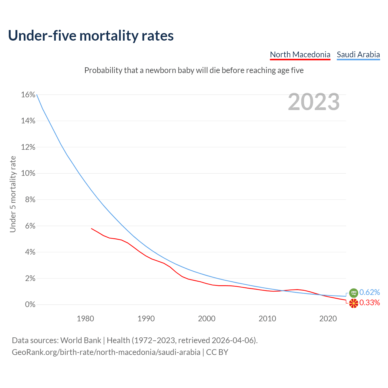 The chance that a newborn baby will die before reaching age five is 0.33% in North Macedonia and 0.62% in Saudi Arabia. Above is a chart with historical data on under-five mortality rates.