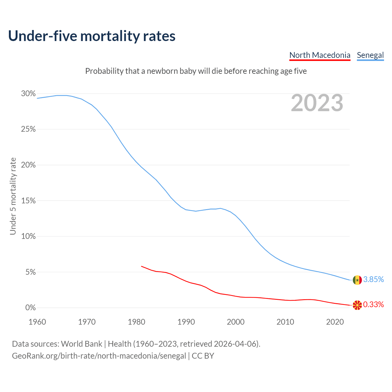 The chance that a newborn baby will die before reaching age five is 0.33% in North Macedonia and 3.85% in Senegal. Above is a chart with historical data on under-five mortality rates.