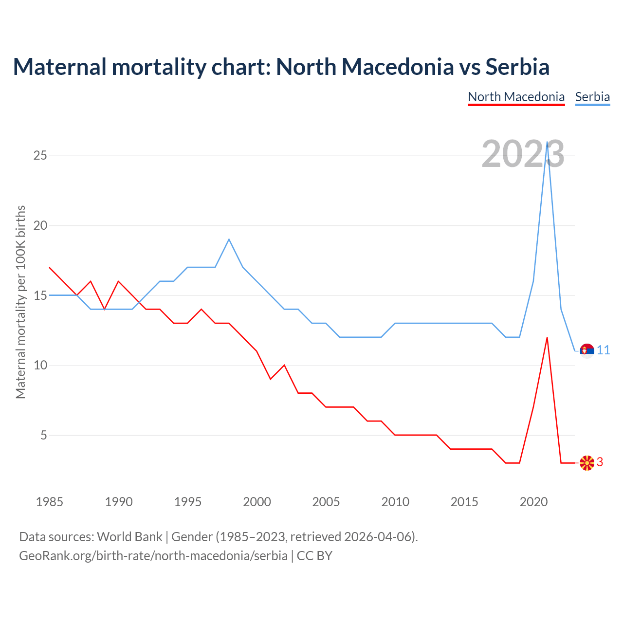 The maternal mortality rate, which is the probability of dying during childbirth or within 42 days of pregnancy termination, is 3 deaths per 100,000 live births in North Macedonia, compared to 11 deaths in Serbia.