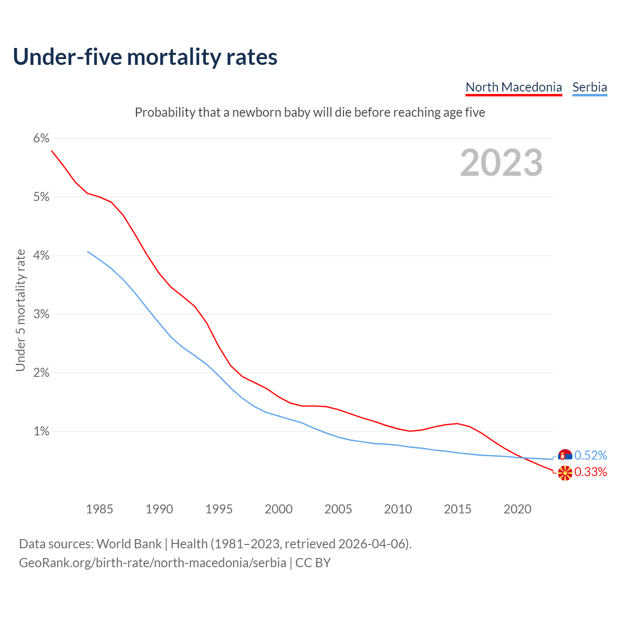 The chance that a newborn baby will die before reaching age five is 0.33% in North Macedonia and 0.52% in Serbia. Above is a chart with historical data on under-five mortality rates.