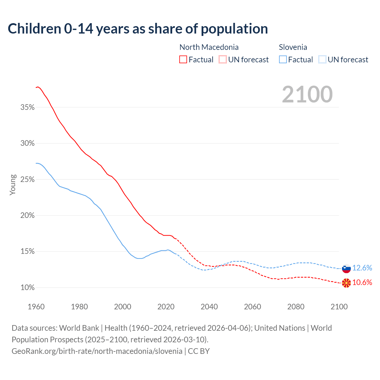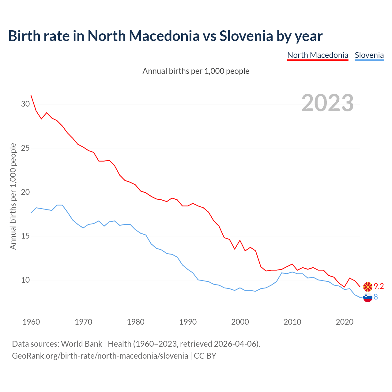 North Macedonia has an annual birth rate of 9.2 births per 1,000 people, compared to 8 for Slovenia. The average number of children a woman is expected to have during her lifetime — the fertility rate, is 1.5 in North Macedonia and 1.51 in Slovenia — 0.67% difference.
