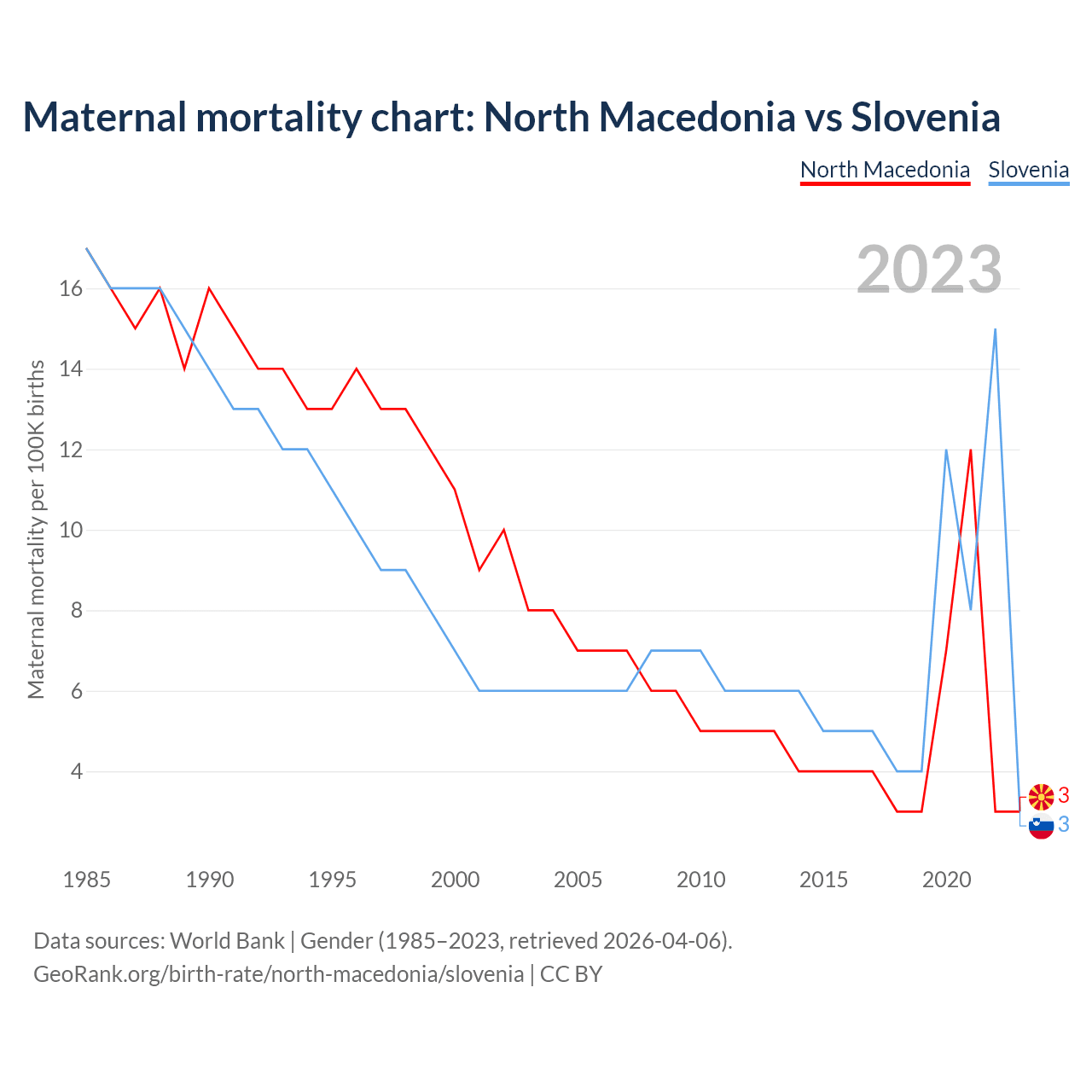 The maternal mortality rate, which is the probability of dying during childbirth or within 42 days of pregnancy termination, is 3 deaths per 100,000 live births in North Macedonia, compared to 3 deaths in Slovenia.