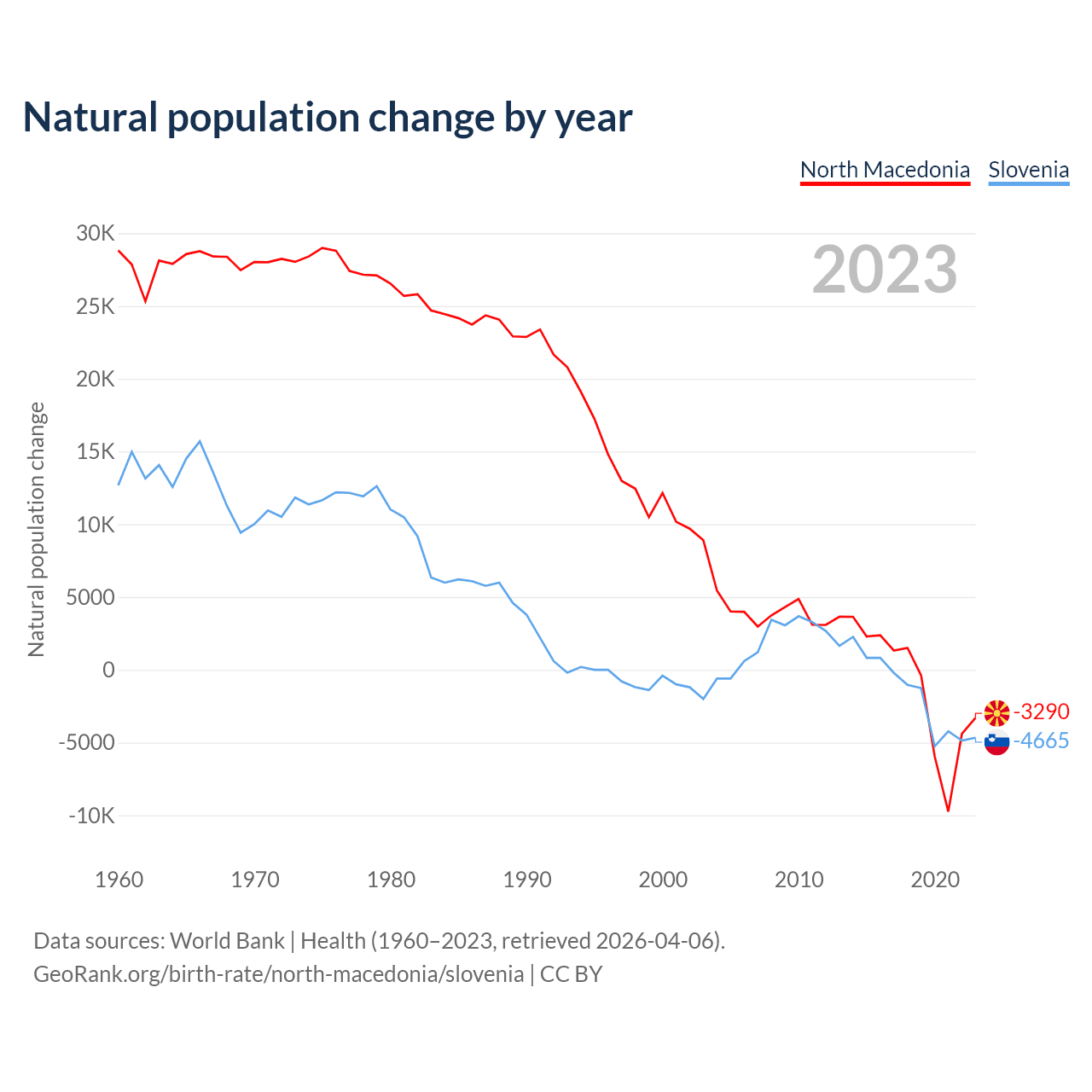 According to the latest available data on birth rates, the fertility rate in North Macedonia was 1.5 children per woman in 2023, compared to 1.51 in Slovenia in 2023. The replacement level is considered to be 2.1 children per woman.