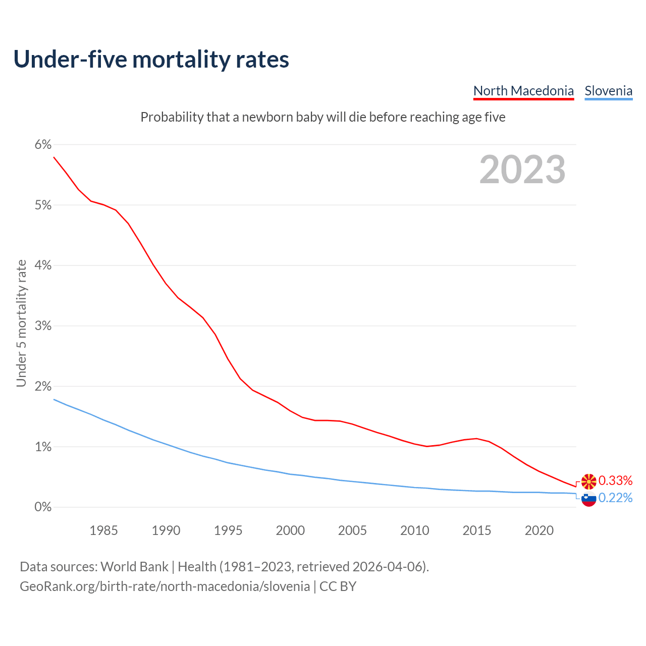 The chance that a newborn baby will die before reaching age five is 0.33% in North Macedonia and 0.22% in Slovenia. Above is a chart with historical data on under-five mortality rates.