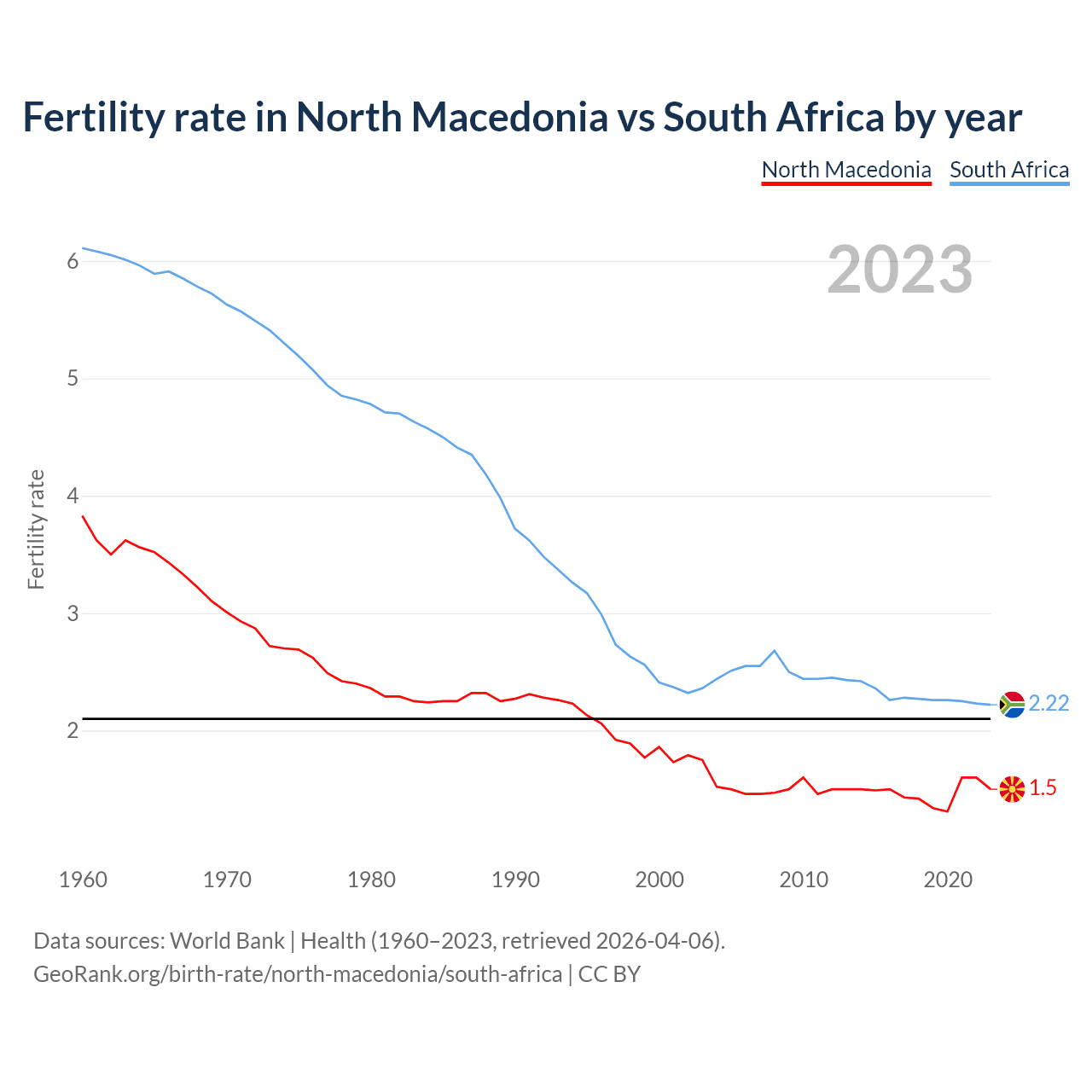 1960 vs 2023, the fertility rate has decreased by 60.8% in North Macedonia and by 63.7% in South Africa — in 1960, it was 3.83 and 6.11, respectively.