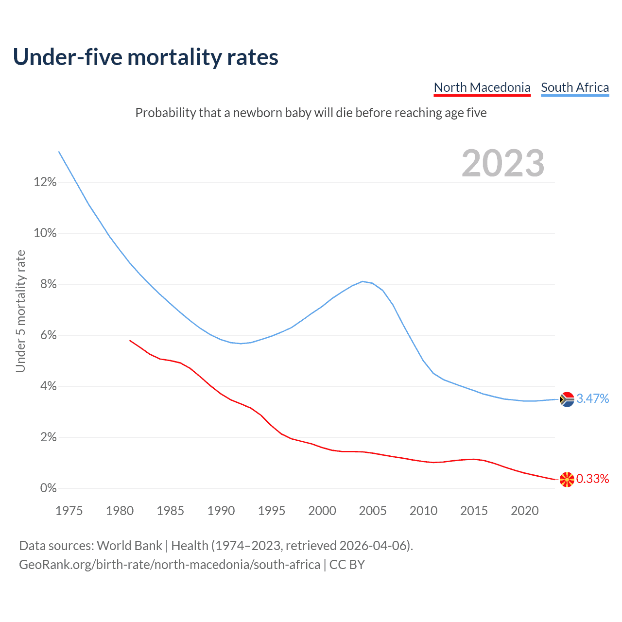 The chance that a newborn baby will die before reaching age five is 0.33% in North Macedonia and 3.47% in South Africa. Above is a chart with historical data on under-five mortality rates.
