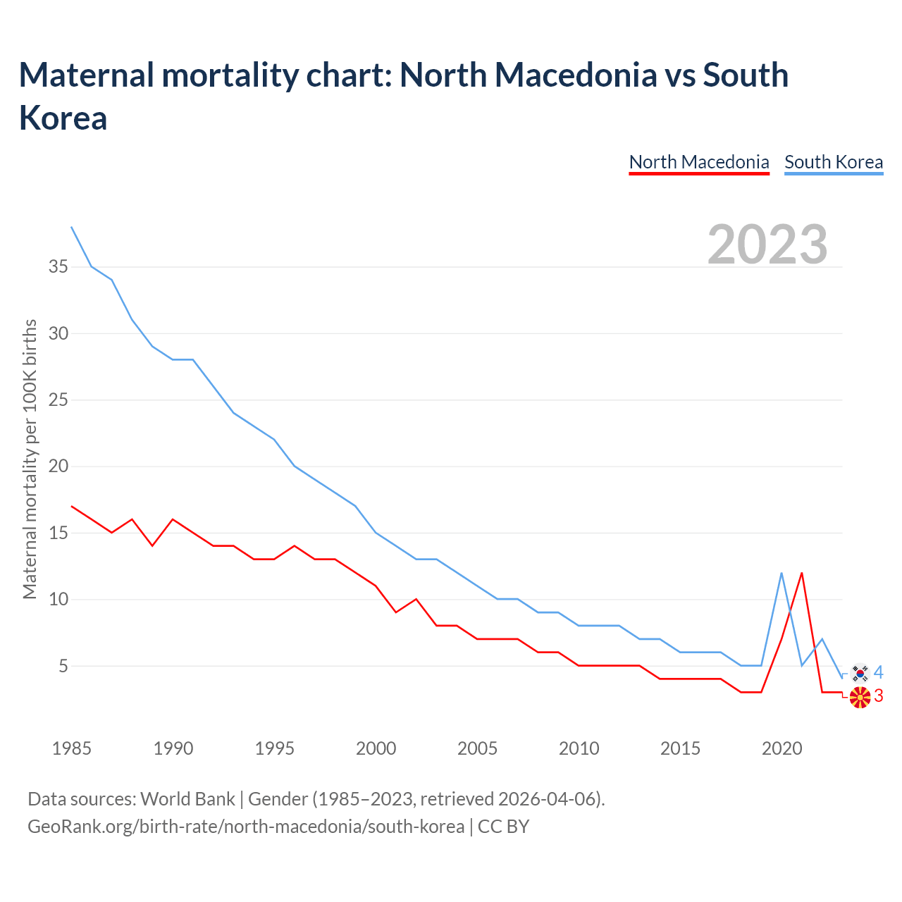 The maternal mortality rate, which is the probability of dying during childbirth or within 42 days of pregnancy termination, is 3 deaths per 100,000 live births in North Macedonia, compared to 4 deaths in South Korea.