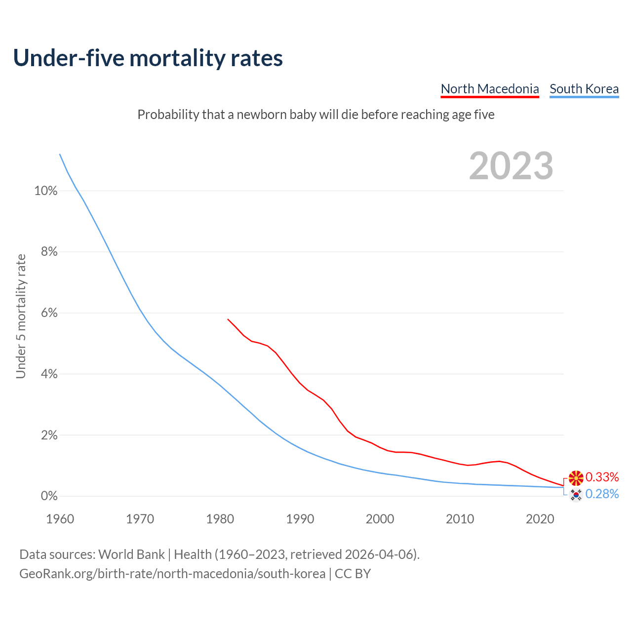 The chance that a newborn baby will die before reaching age five is 0.33% in North Macedonia and 0.28% in South Korea. Above is a chart with historical data on under-five mortality rates.