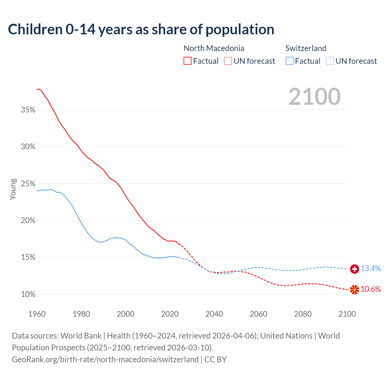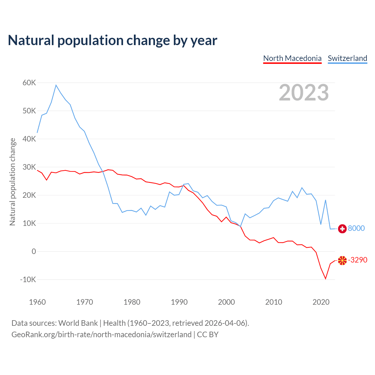 According to the latest available data on birth rates, the fertility rate in North Macedonia was 1.5 children per woman in 2023, compared to 1.33 in Switzerland in 2023. The replacement level is considered to be 2.1 children per woman.