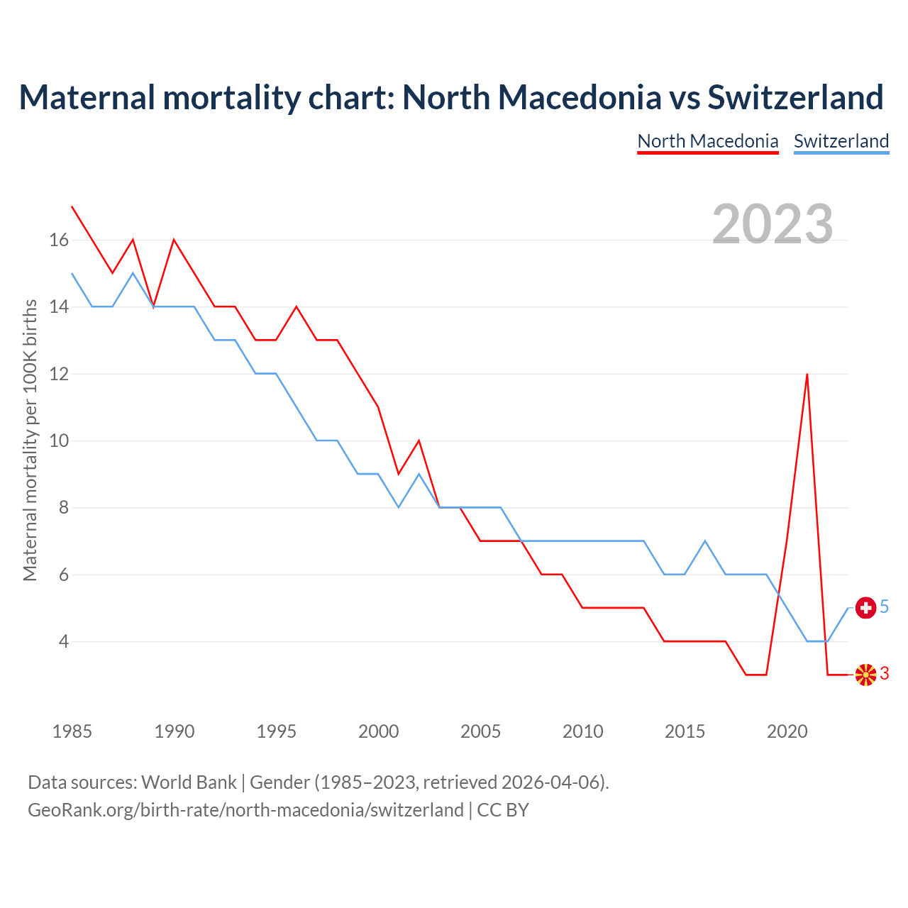 The maternal mortality rate, which is the probability of dying during childbirth or within 42 days of pregnancy termination, is 3 deaths per 100,000 live births in North Macedonia, compared to 5 deaths in Switzerland.