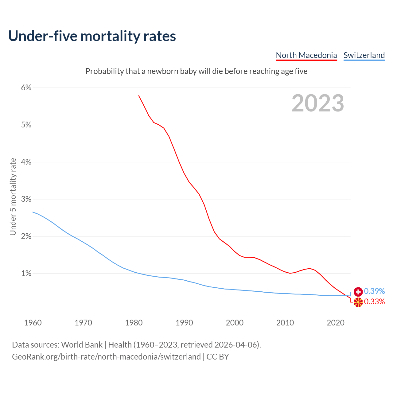 The chance that a newborn baby will die before reaching age five is 0.33% in North Macedonia and 0.39% in Switzerland. Above is a chart with historical data on under-five mortality rates.
