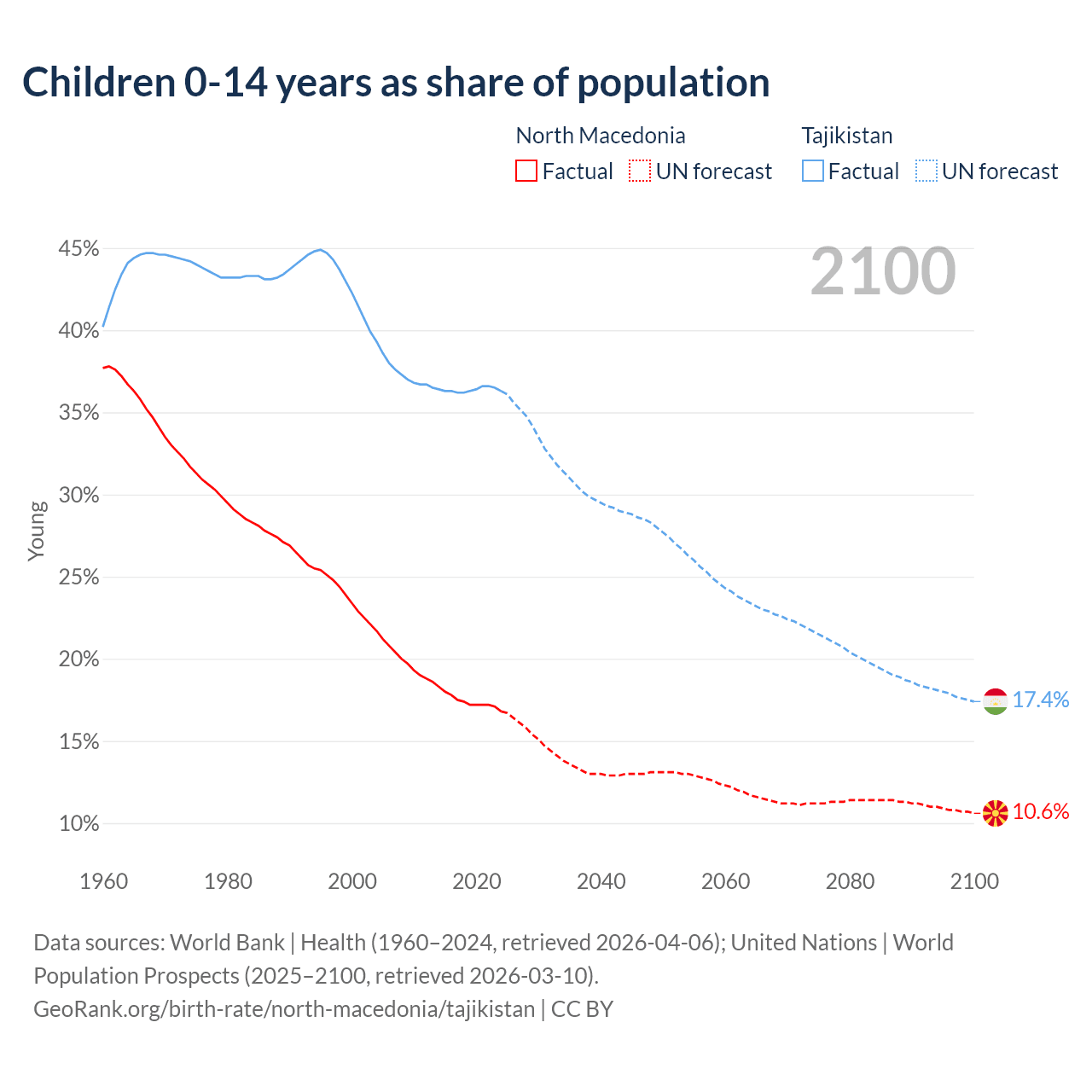 North Macedonia has an annual birth rate of 9.2 births per 1,000 people, compared to 26.1 for Tajikistan. The average number of children a woman is expected to have during her lifetime — the fertility rate, is 1.5 in North Macedonia and 3.07 in Tajikistan — 104.8% difference.