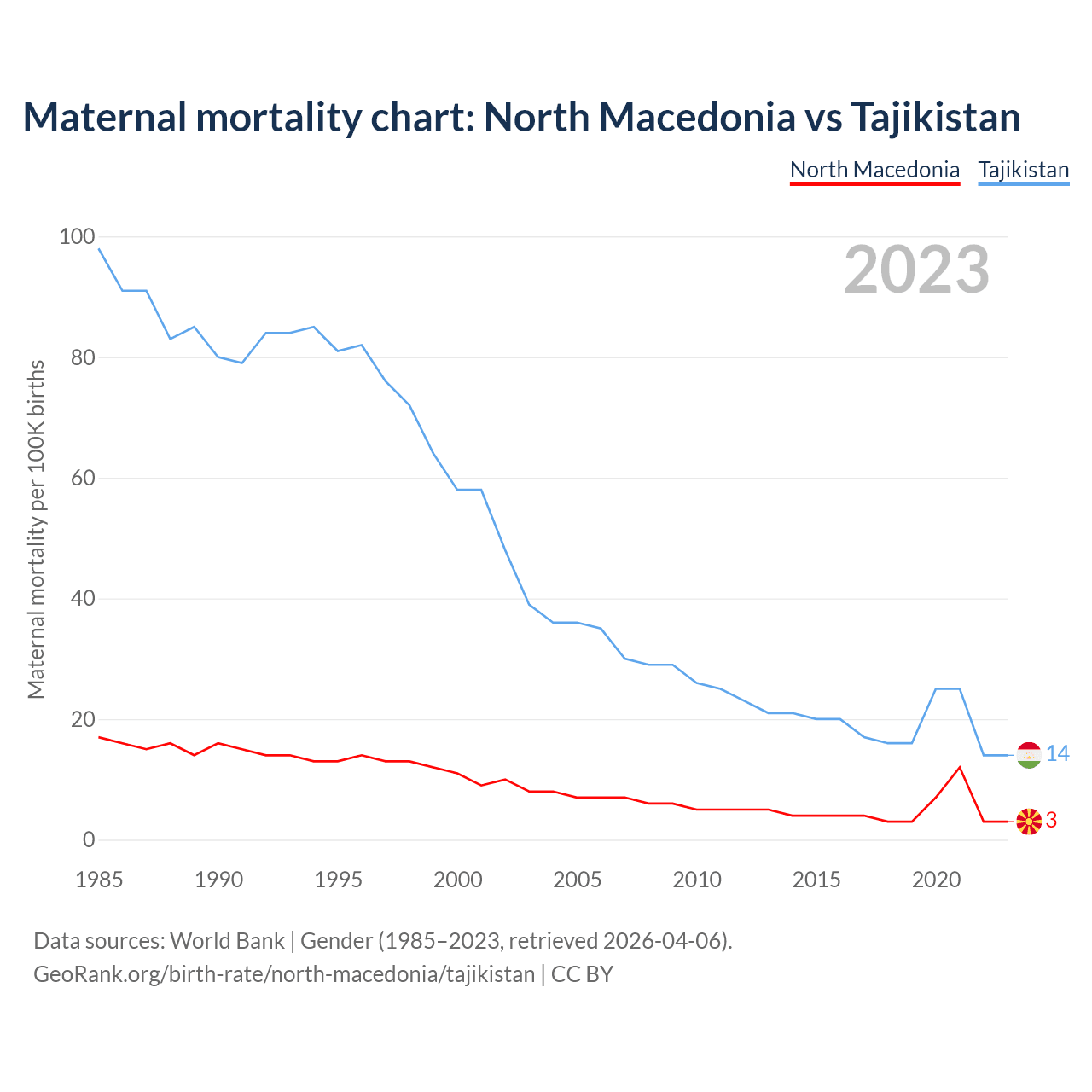 The maternal mortality rate, which is the probability of dying during childbirth or within 42 days of pregnancy termination, is 3 deaths per 100,000 live births in North Macedonia, compared to 14 deaths in Tajikistan.