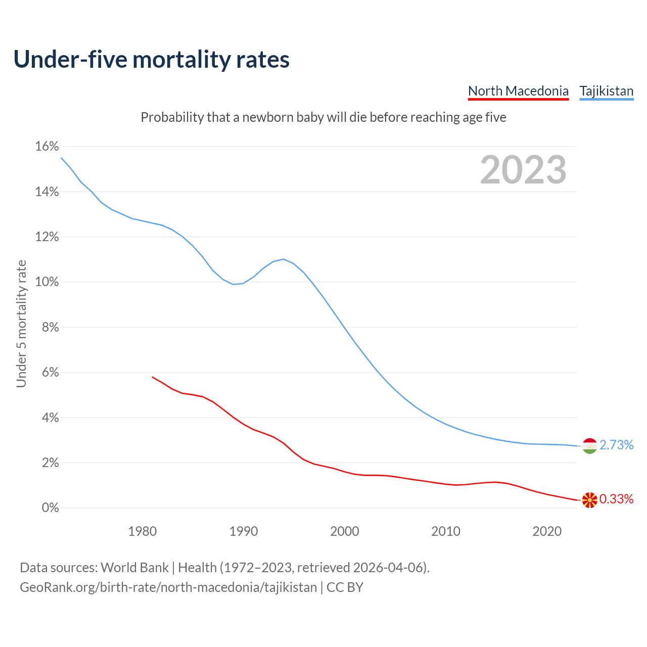 The chance that a newborn baby will die before reaching age five is 0.33% in North Macedonia and 2.73% in Tajikistan. Above is a chart with historical data on under-five mortality rates.