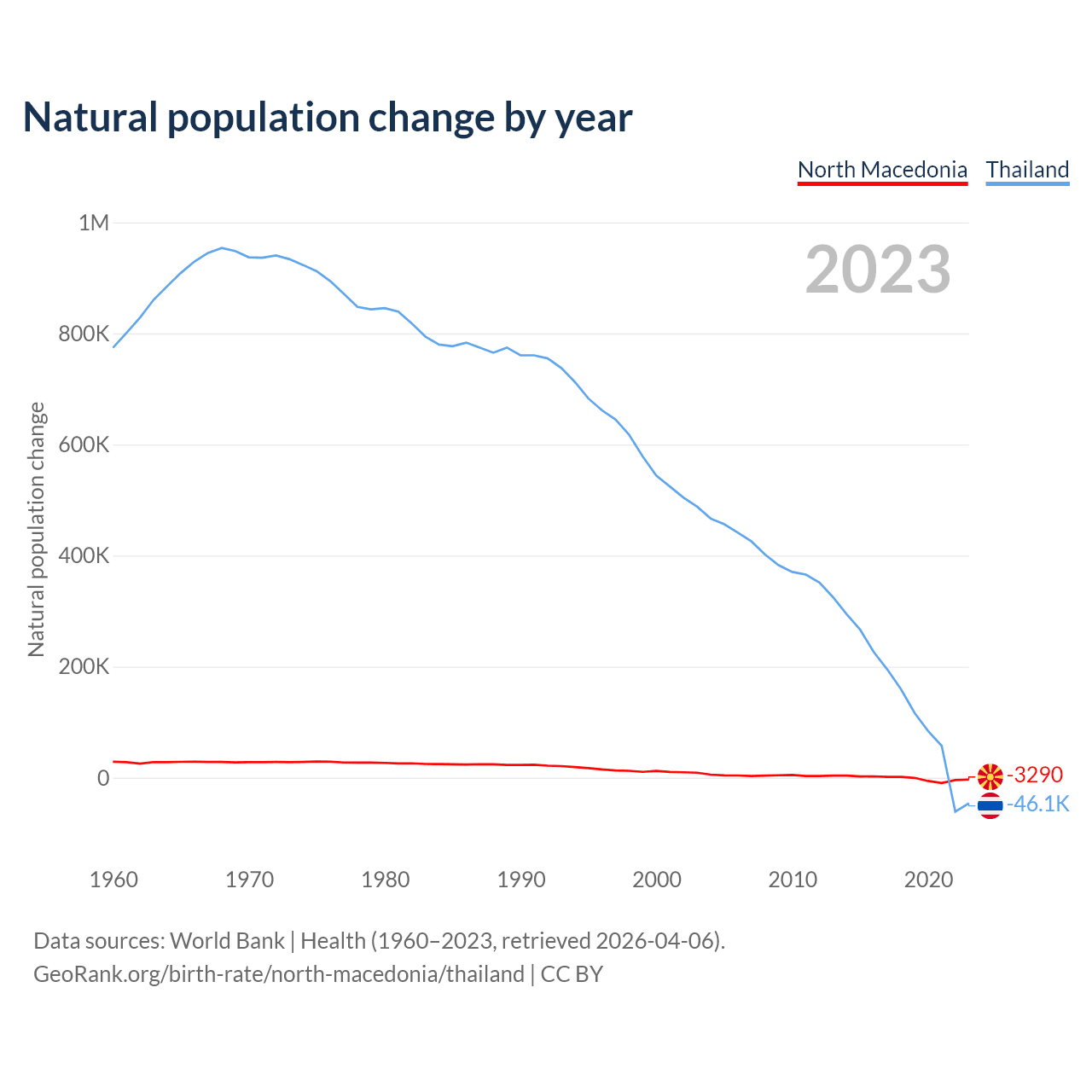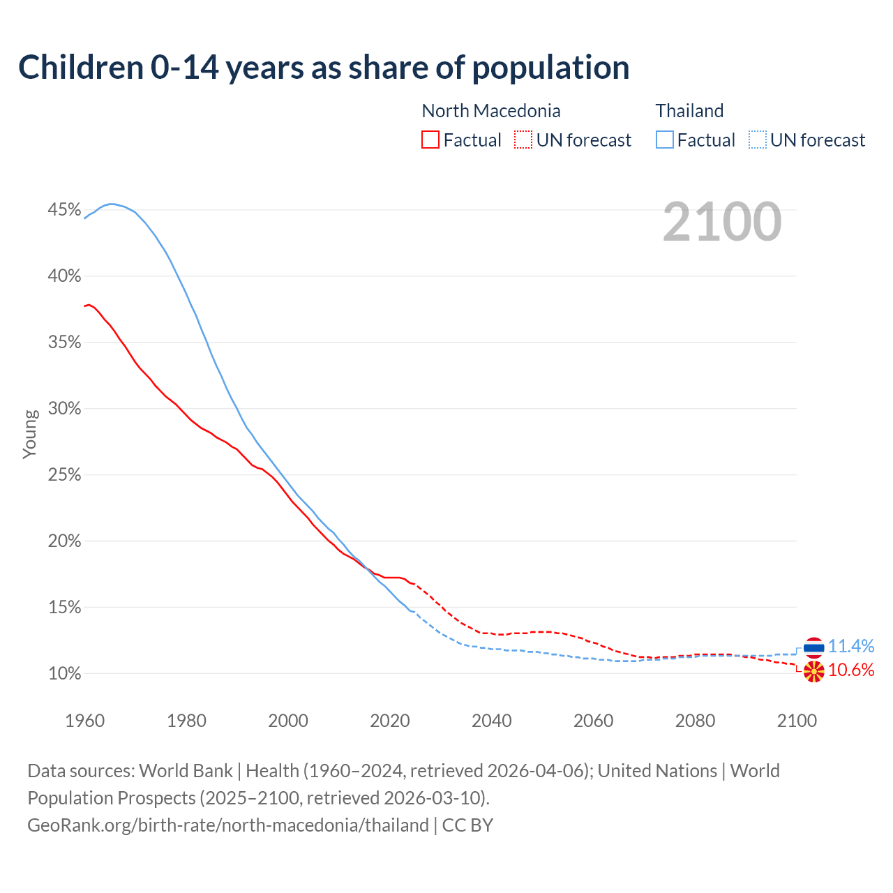 According to the latest available data on birth rates, the fertility rate in North Macedonia was 1.5 children per woman in 2023, compared to 1.21 in Thailand in 2023. The replacement level is considered to be 2.1 children per woman.