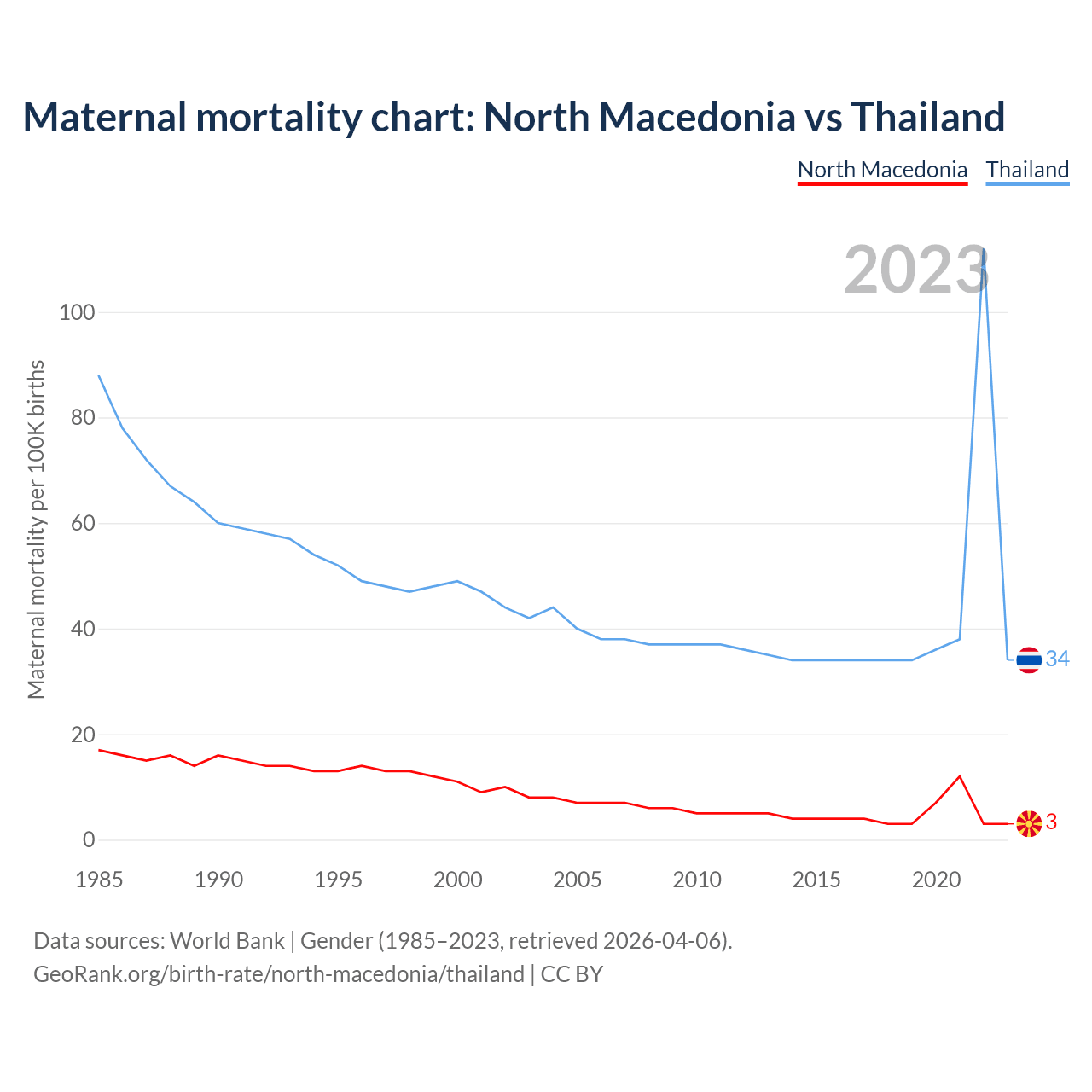 The maternal mortality rate, which is the probability of dying during childbirth or within 42 days of pregnancy termination, is 3 deaths per 100,000 live births in North Macedonia, compared to 34 deaths in Thailand.
