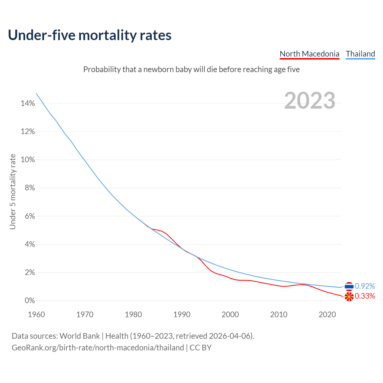 The chance that a newborn baby will die before reaching age five is 0.33% in North Macedonia and 0.92% in Thailand. Above is a chart with historical data on under-five mortality rates.
