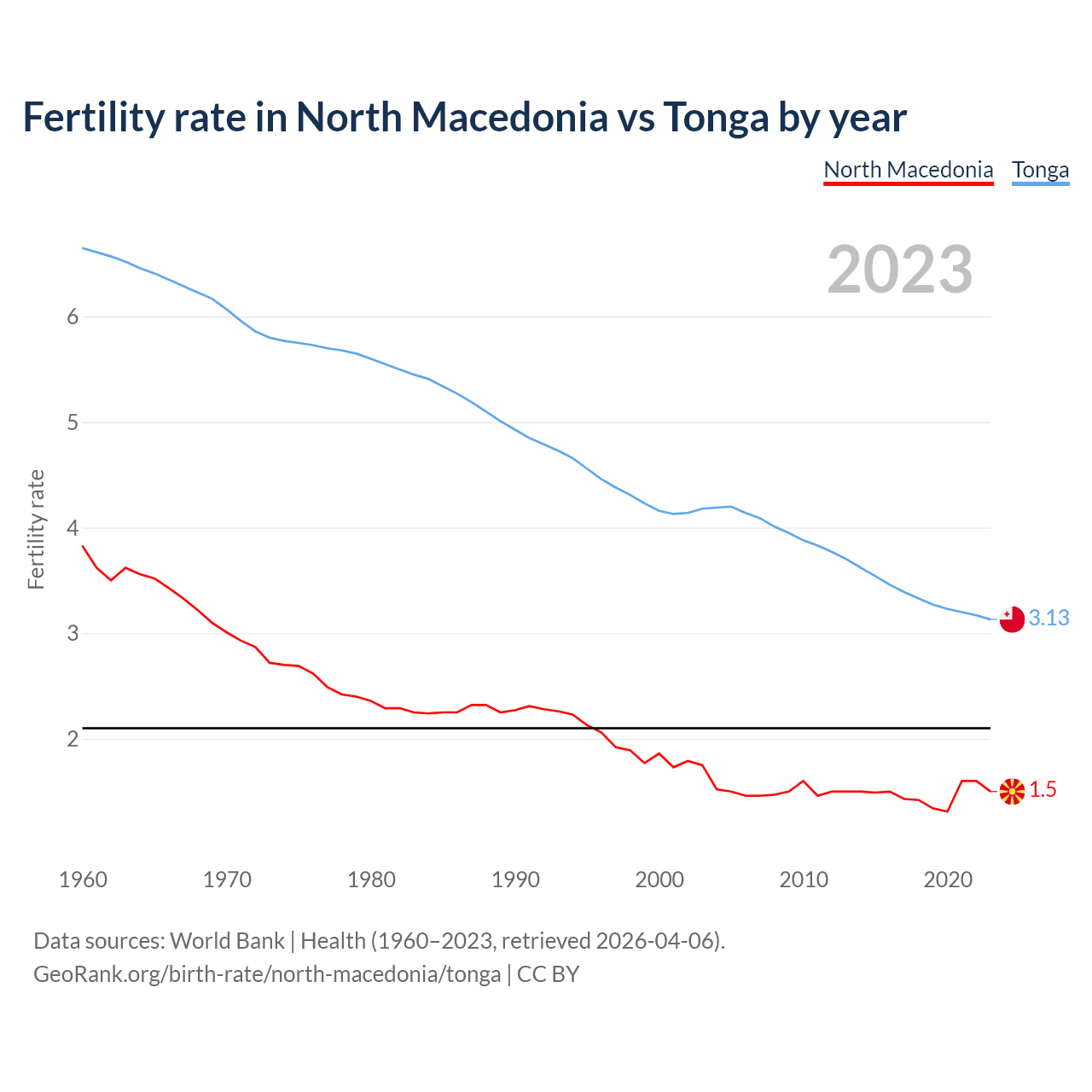 1960 vs 2023, the fertility rate has decreased by 60.8% in North Macedonia and by 53% in Tonga — in 1960, it was 3.83 and 6.65, respectively.