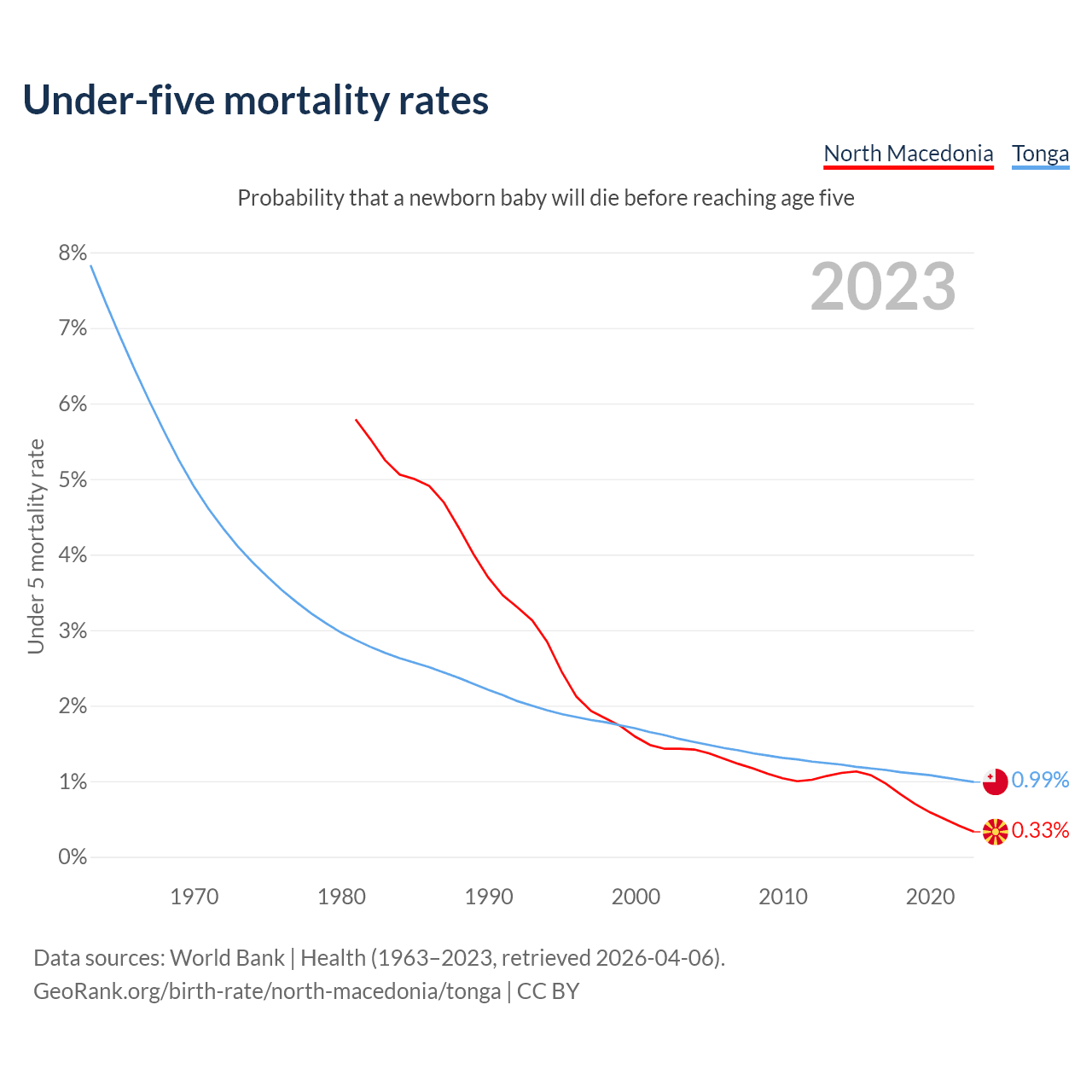 The chance that a newborn baby will die before reaching age five is 0.33% in North Macedonia and 0.99% in Tonga. Above is a chart with historical data on under-five mortality rates.