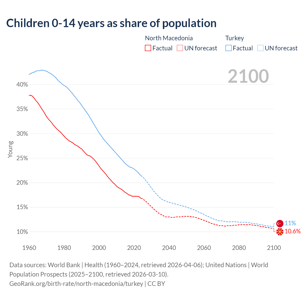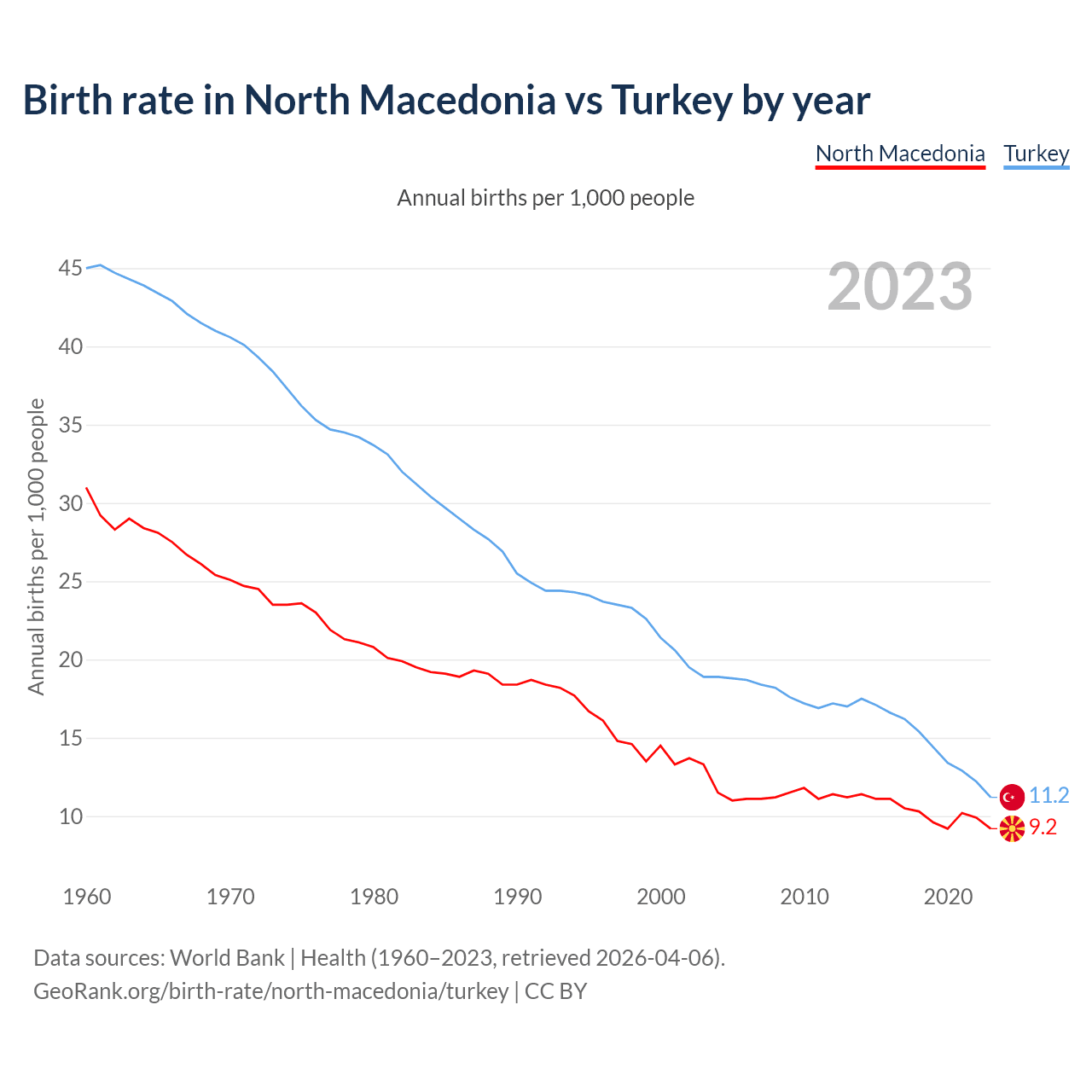 North Macedonia has an annual birth rate of 9.2 births per 1,000 people, compared to 11.2 for Turkey. The average number of children a woman is expected to have during her lifetime — the fertility rate, is 1.5 in North Macedonia and 1.51 in Turkey — 0.67% difference.