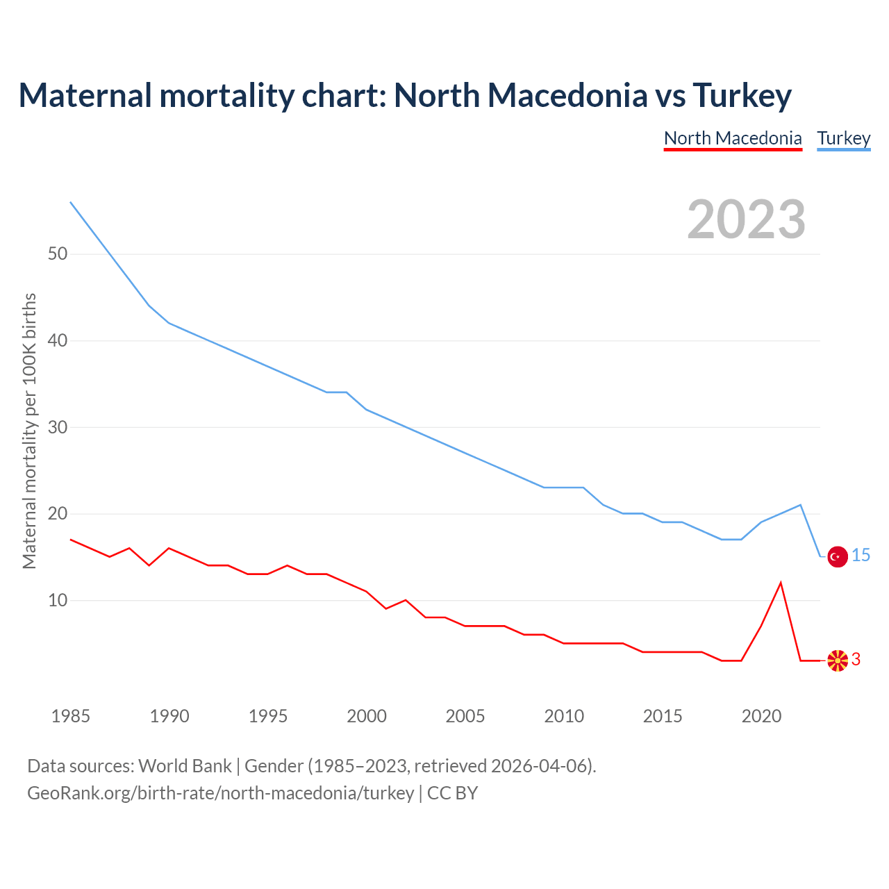 The maternal mortality rate, which is the probability of dying during childbirth or within 42 days of pregnancy termination, is 3 deaths per 100,000 live births in North Macedonia, compared to 15 deaths in Turkey.