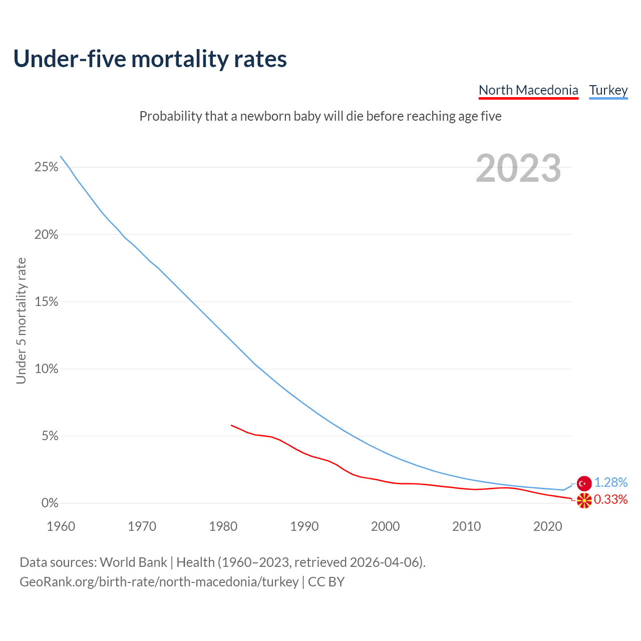The chance that a newborn baby will die before reaching age five is 0.33% in North Macedonia and 1.28% in Turkey. Above is a chart with historical data on under-five mortality rates.