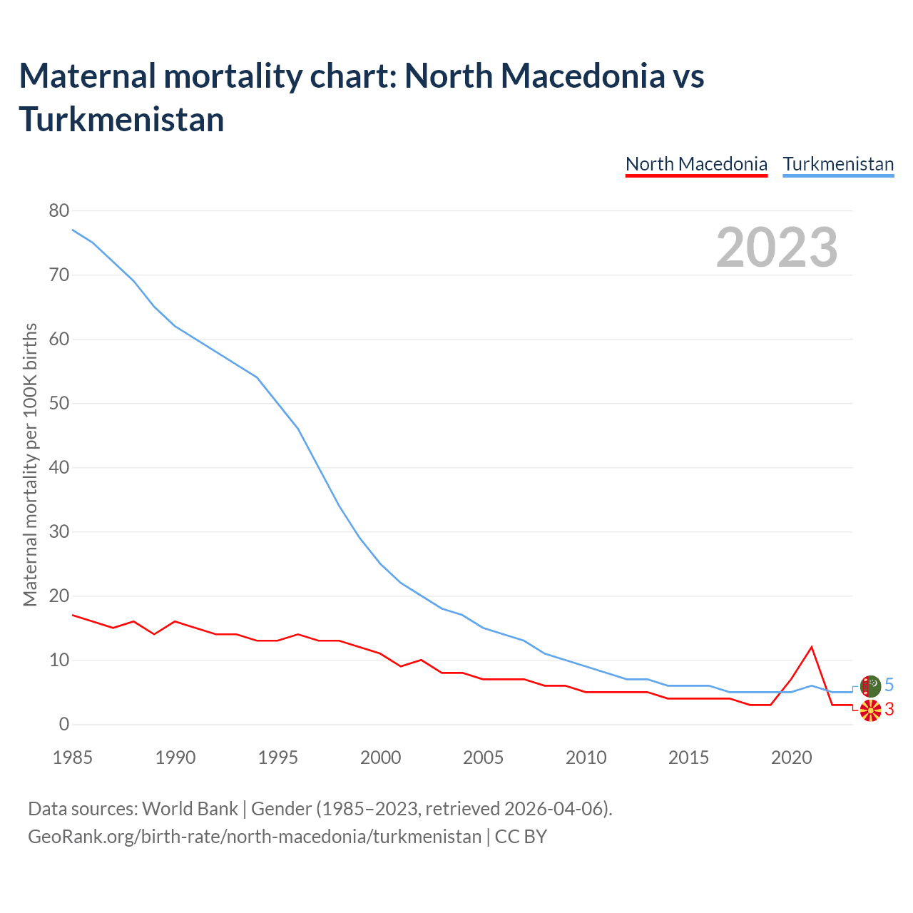 The maternal mortality rate, which is the probability of dying during childbirth or within 42 days of pregnancy termination, is 3 deaths per 100,000 live births in North Macedonia, compared to 5 deaths in Turkmenistan.