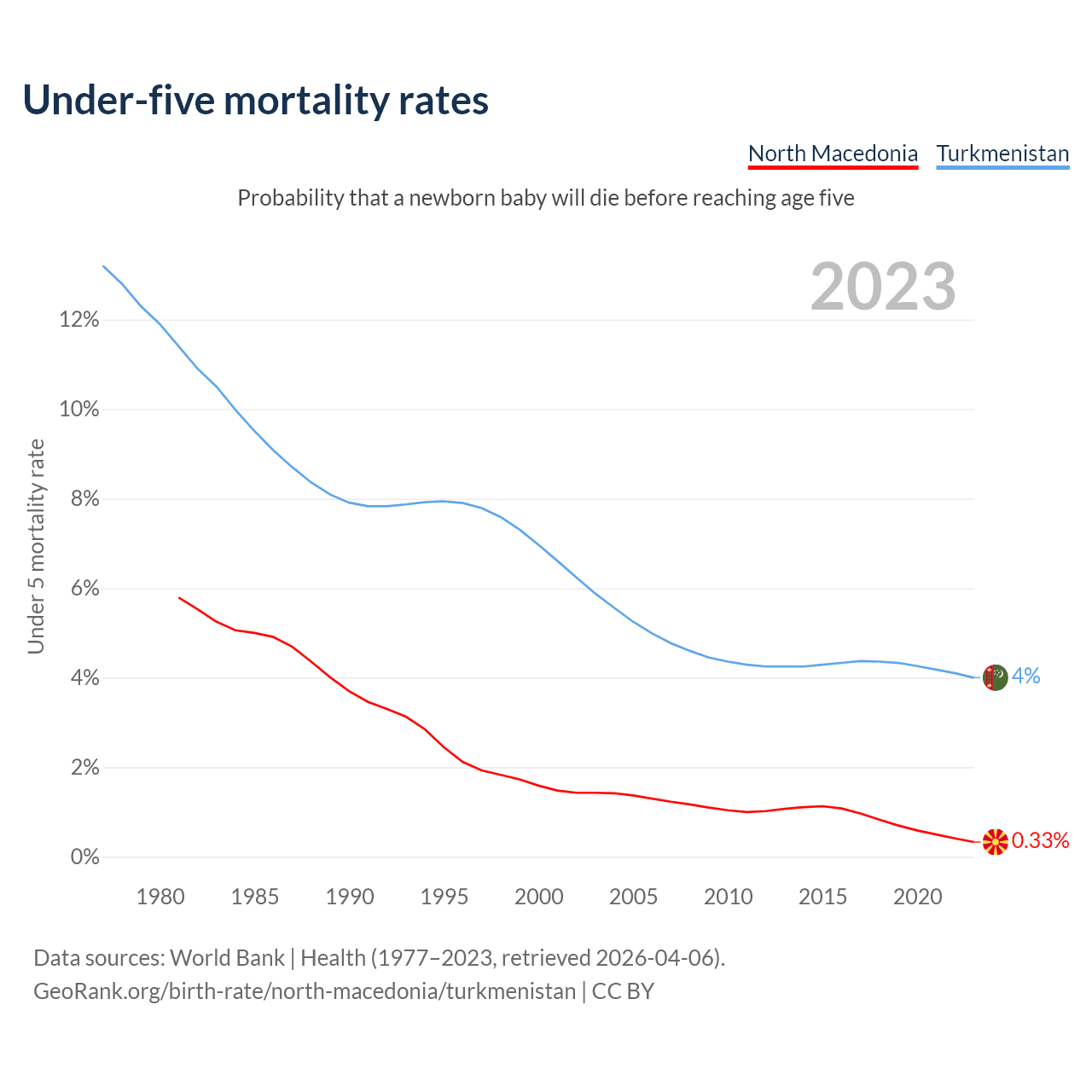 The chance that a newborn baby will die before reaching age five is 0.33% in North Macedonia and 4% in Turkmenistan. Above is a chart with historical data on under-five mortality rates.
