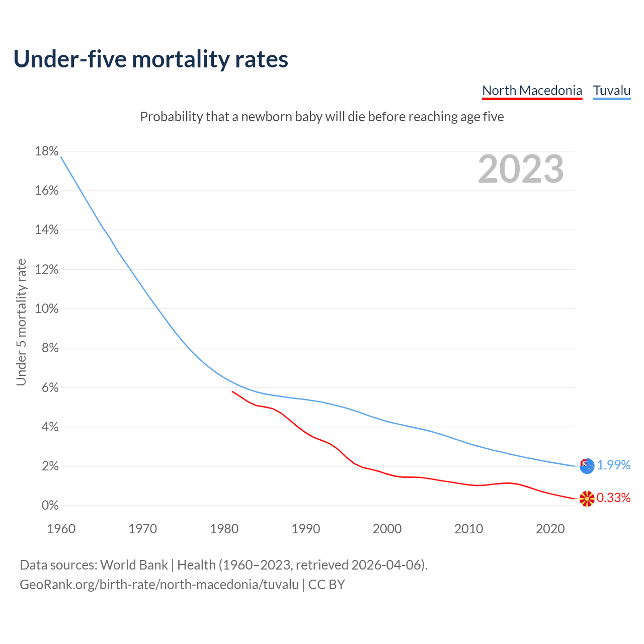 The chance that a newborn baby will die before reaching age five is 0.33% in North Macedonia and 1.99% in Tuvalu. Above is a chart with historical data on under-five mortality rates.