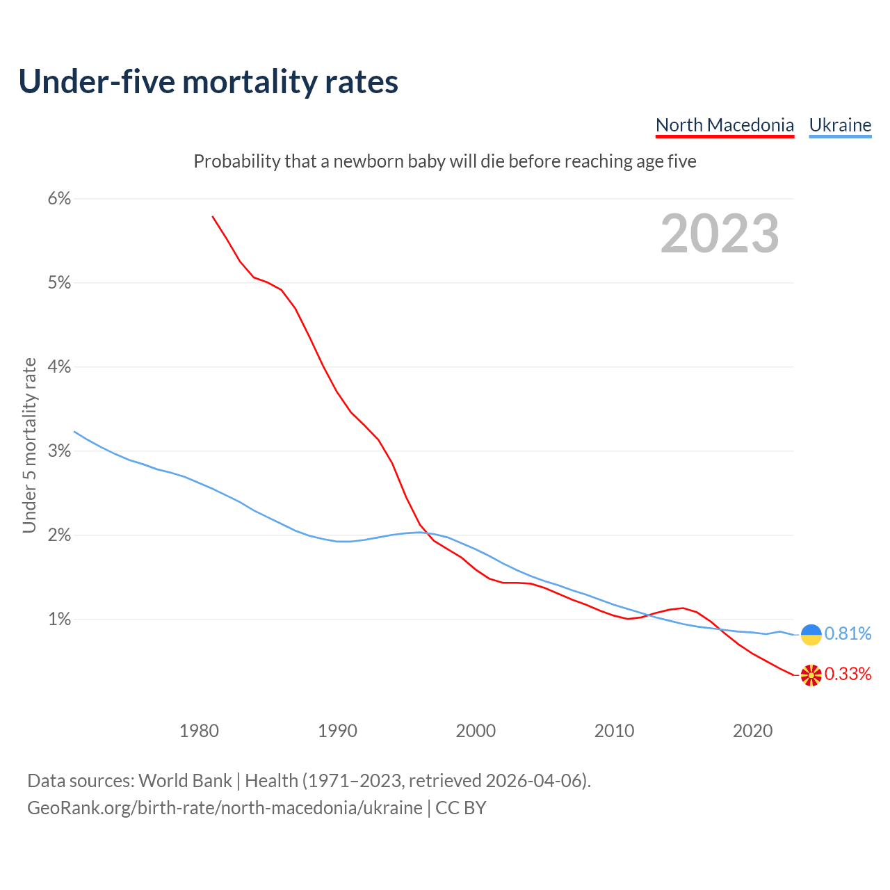 The chance that a newborn baby will die before reaching age five is 0.33% in North Macedonia and 0.81% in Ukraine. Above is a chart with historical data on under-five mortality rates.