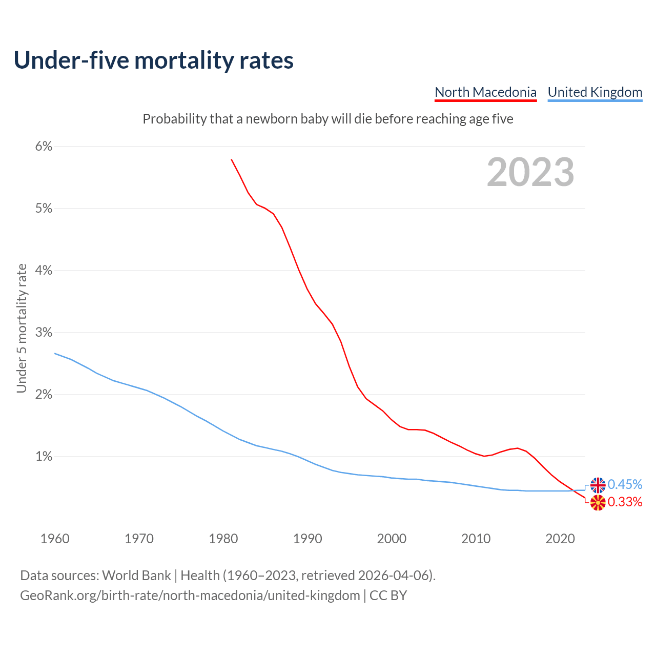 The chance that a newborn baby will die before reaching age five is 0.33% in North Macedonia and 0.45% in the United Kingdom. Above is a chart with historical data on under-five mortality rates.