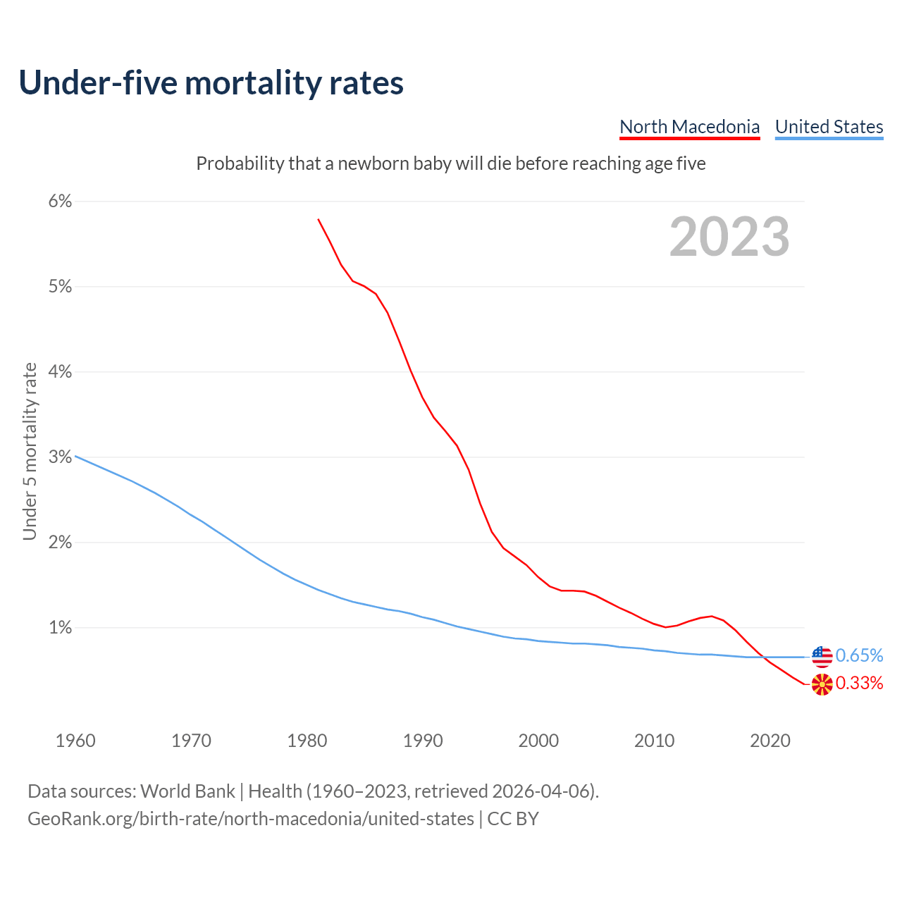 The chance that a newborn baby will die before reaching age five is 0.33% in North Macedonia and 0.65% in the United States. Above is a chart with historical data on under-five mortality rates.