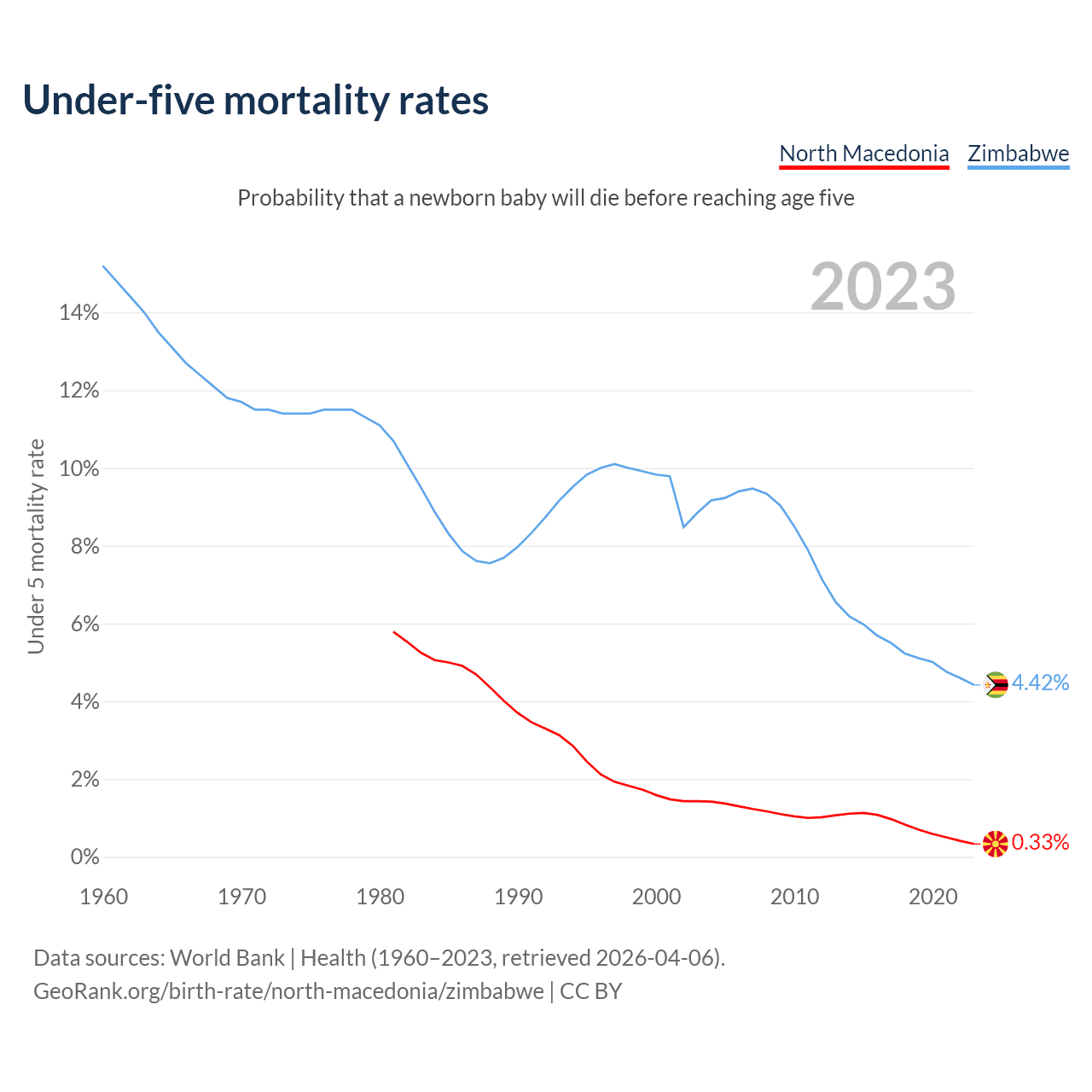 The chance that a newborn baby will die before reaching age five is 0.33% in North Macedonia and 4.42% in Zimbabwe. Above is a chart with historical data on under-five mortality rates.
