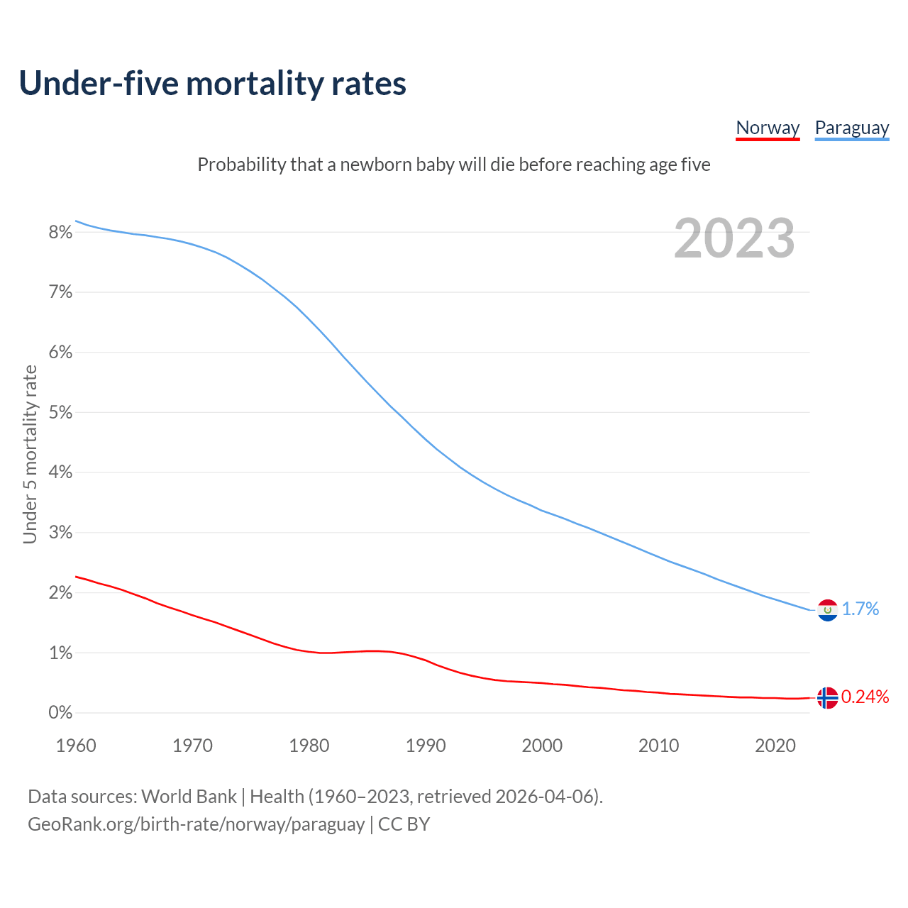 The chance that a newborn baby will die before reaching age five is 0.24% in Norway and 1.7% in Paraguay. Above is a chart with historical data on under-five mortality rates.