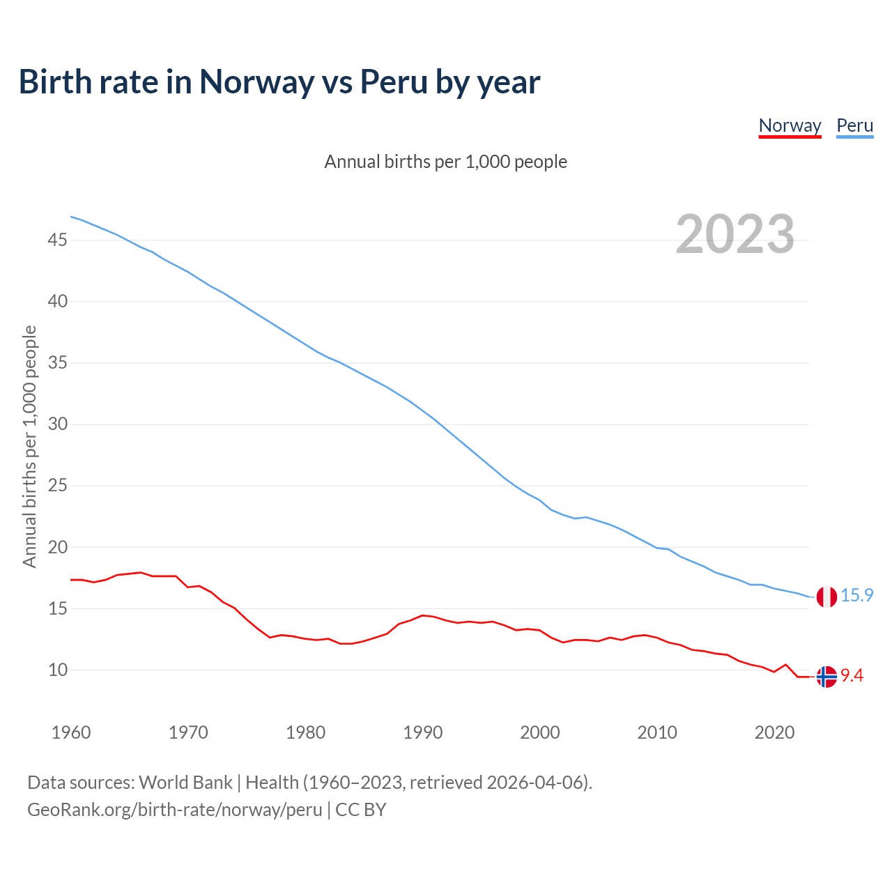 Norway has an annual birth rate of 9.4 births per 1,000 people, compared to 15.9 for Peru. The average number of children a woman is expected to have during her lifetime — the fertility rate, is 1.4 in Norway and 1.98 in Peru — 41.4% difference.