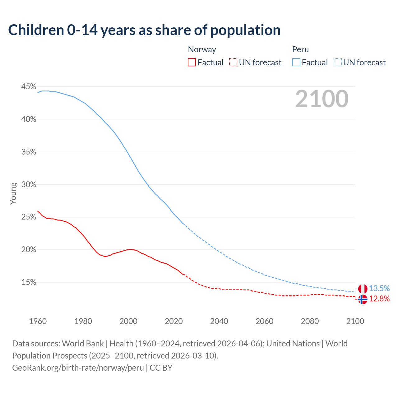 According to the latest available data on birth rates, the fertility rate in Norway was 1.4 children per woman in 2023, compared to 1.98 in Peru in 2023. The replacement level is considered to be 2.1 children per woman.