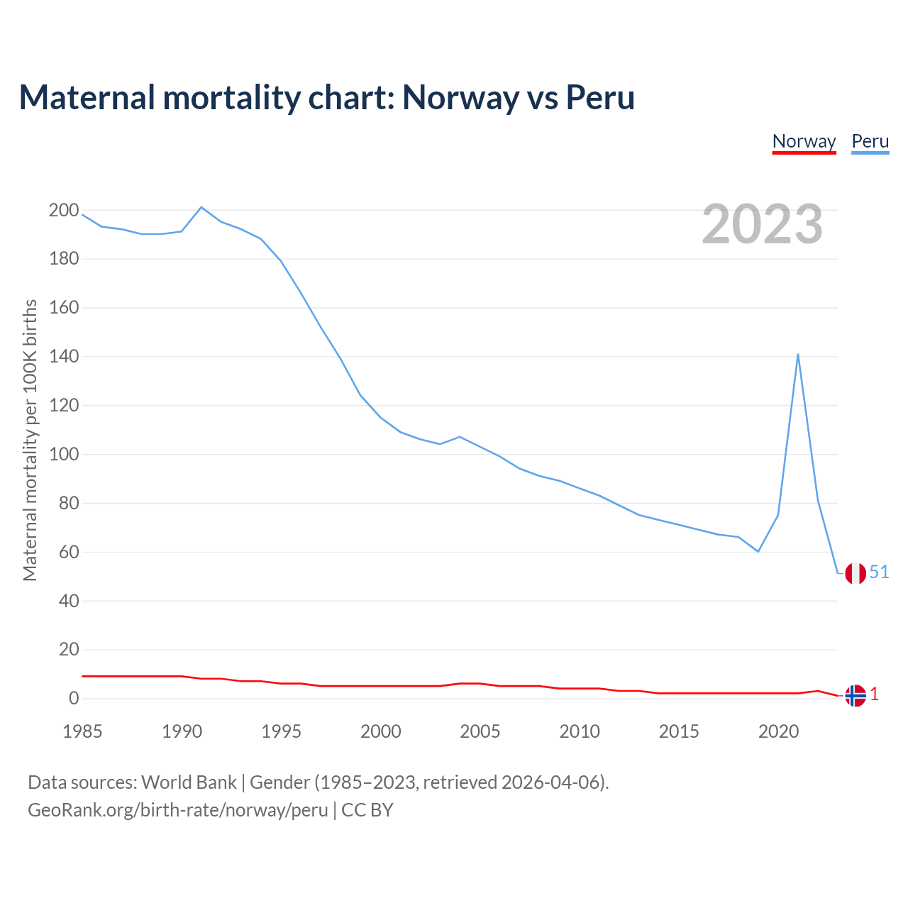 The maternal mortality rate, which is the probability of dying during childbirth or within 42 days of pregnancy termination, is 1 deaths per 100,000 live births in Norway, compared to 51 deaths in Peru.