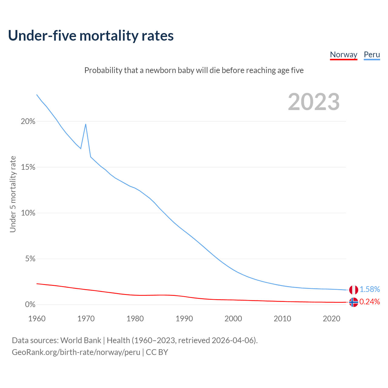 The chance that a newborn baby will die before reaching age five is 0.24% in Norway and 1.58% in Peru. Above is a chart with historical data on under-five mortality rates.