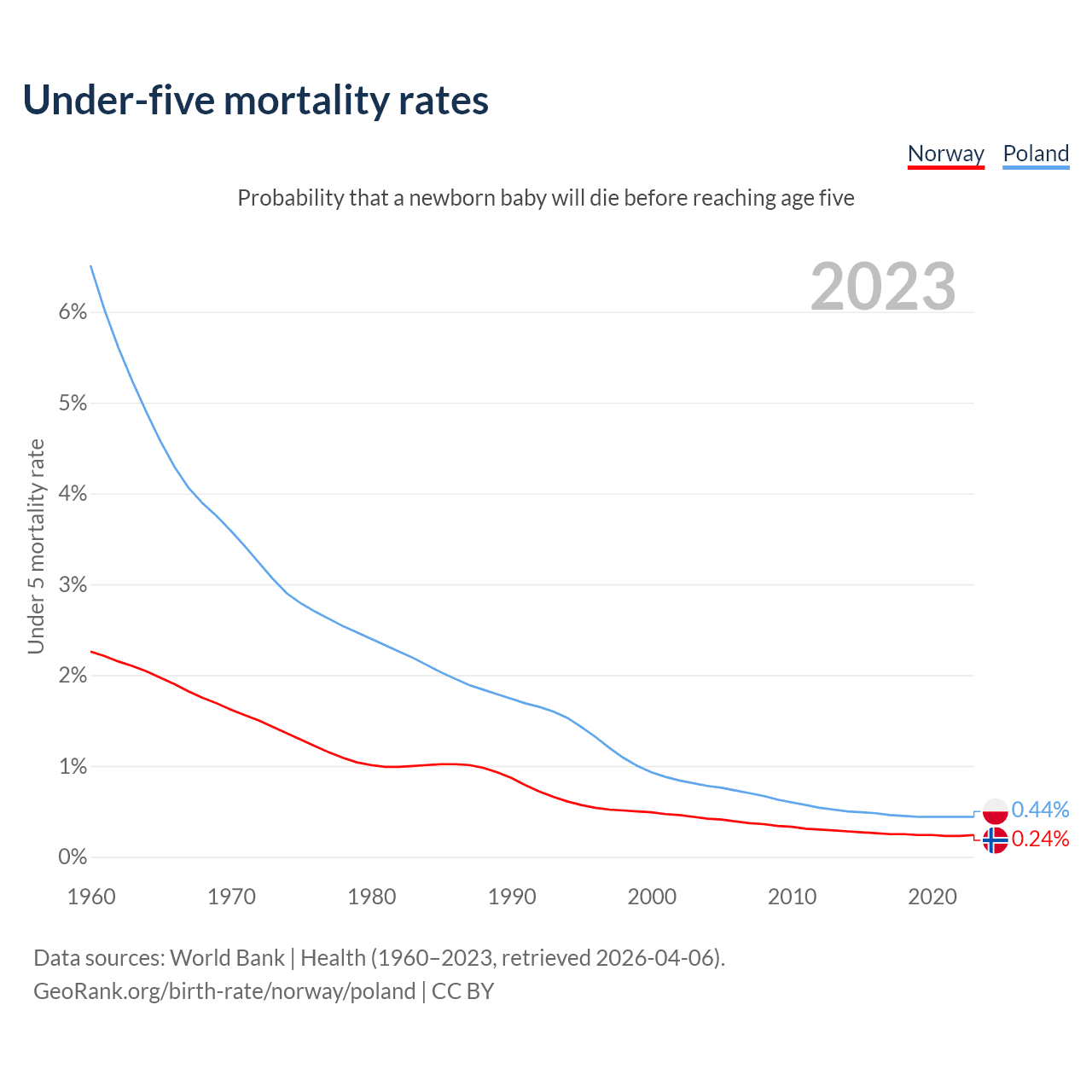 The chance that a newborn baby will die before reaching age five is 0.24% in Norway and 0.44% in Poland. Above is a chart with historical data on under-five mortality rates.