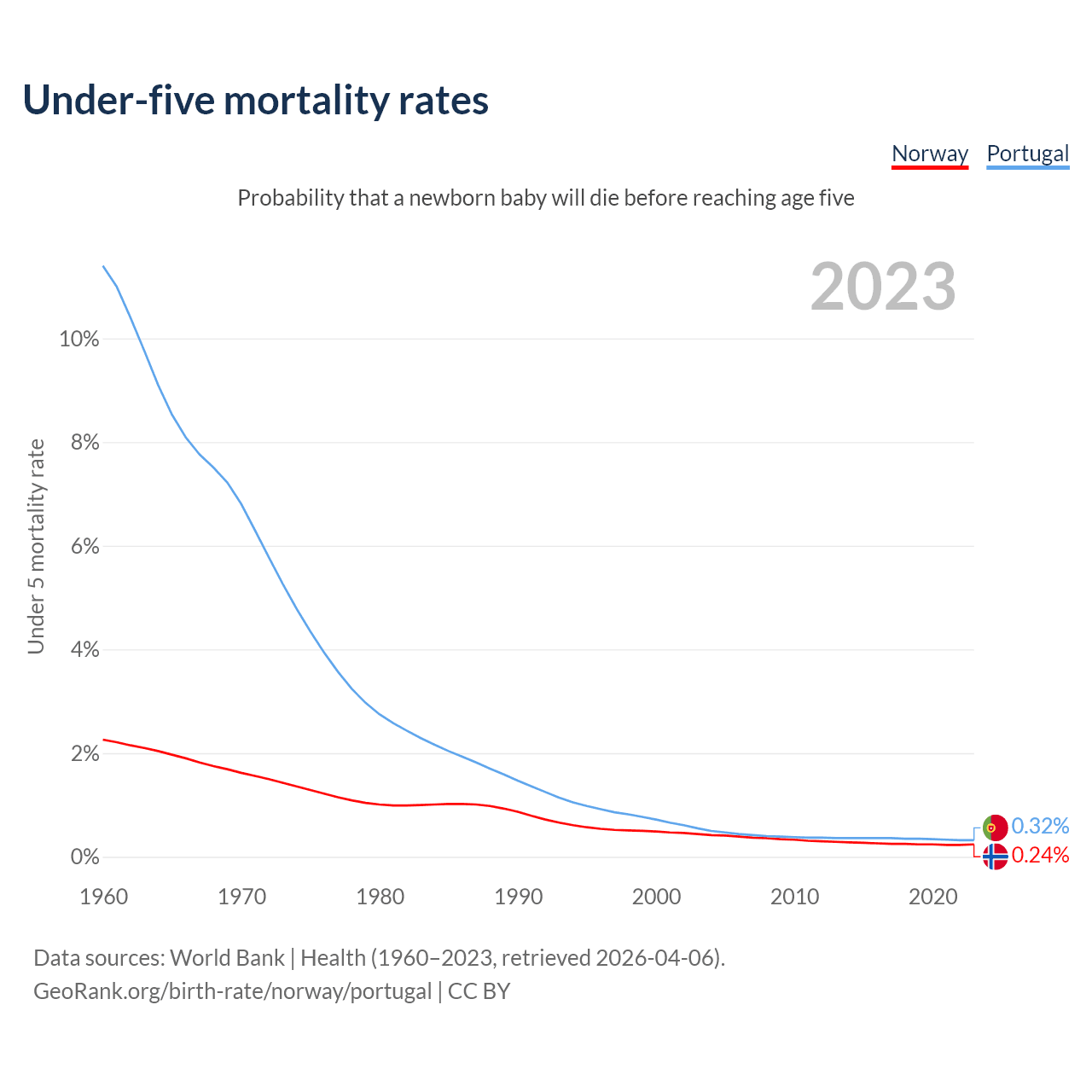 The chance that a newborn baby will die before reaching age five is 0.24% in Norway and 0.32% in Portugal. Above is a chart with historical data on under-five mortality rates.