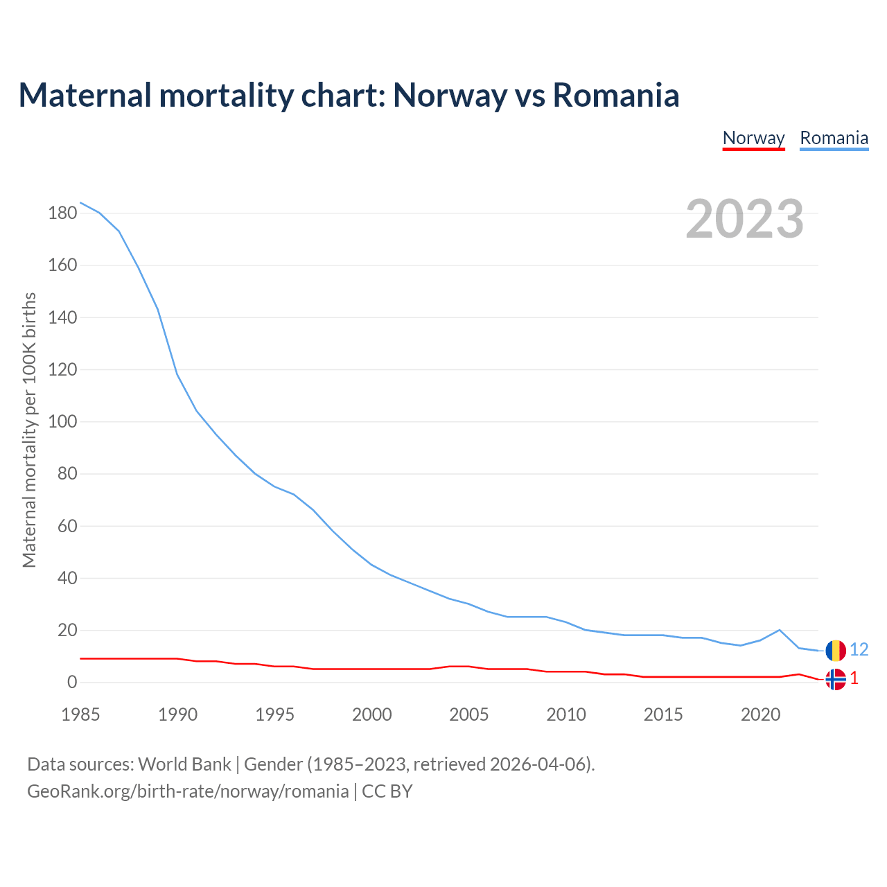 The maternal mortality rate, which is the probability of dying during childbirth or within 42 days of pregnancy termination, is 1 deaths per 100,000 live births in Norway, compared to 12 deaths in Romania.
